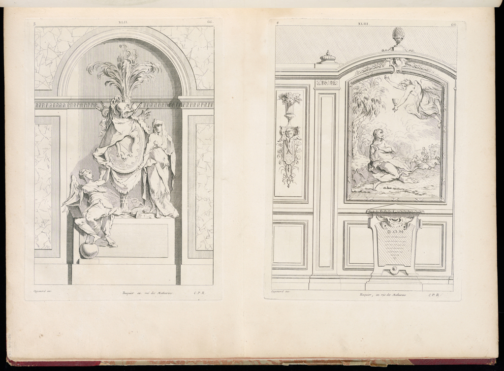 Left Plate: Printed upper left, in plate: 3; Printed upper center, in plate: XLII.; Printed upper right, in plate: GG.; Printed lower center right, in plate: Huquier ex. ruë des Mathurins.; Printed lower right, in plate: C.P.R. Right Plate: Printed upper left, in plate: 4; Printed upper center, in plate: XLIII.; Printed upper right, in plate: GG.; Printed lower center, in plate: Huquier, ex. rue des Mathurins; Printed lower right, in plate: C.P.R. Inscribed in graphite, lower left, in margin: 1921-6-216 (26)