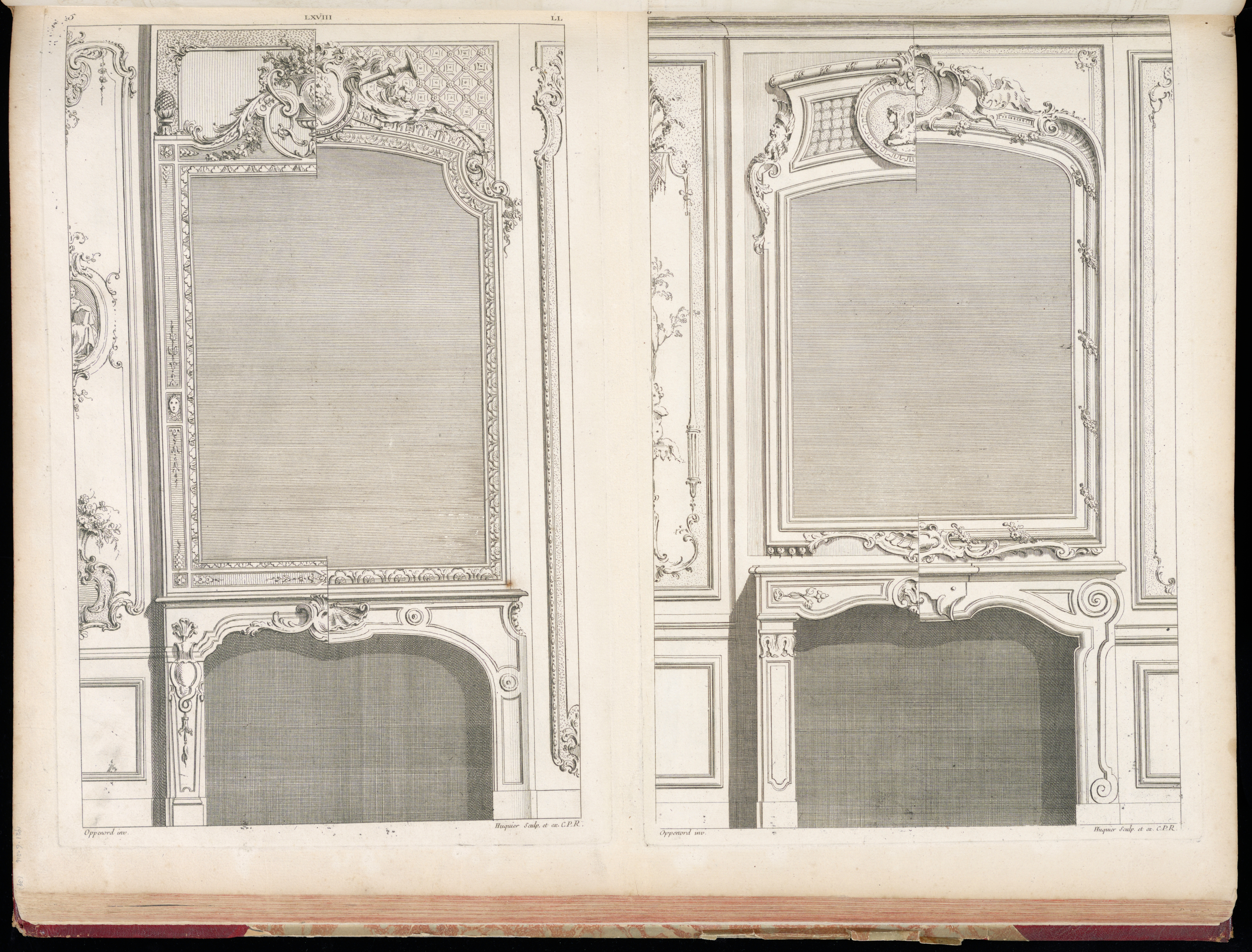 Bound Print, Elevations of Chimneypiece Designs; Designed by Gilles-Marie Oppenord (French, 1672–1742); Print Maker: Gabriel Huquier (French, 1695–1772); Published by Chez Huquier; France; etching and engraving on laid paper; Purchased for the Museum by the Advisory Council; 1921-6-216-39