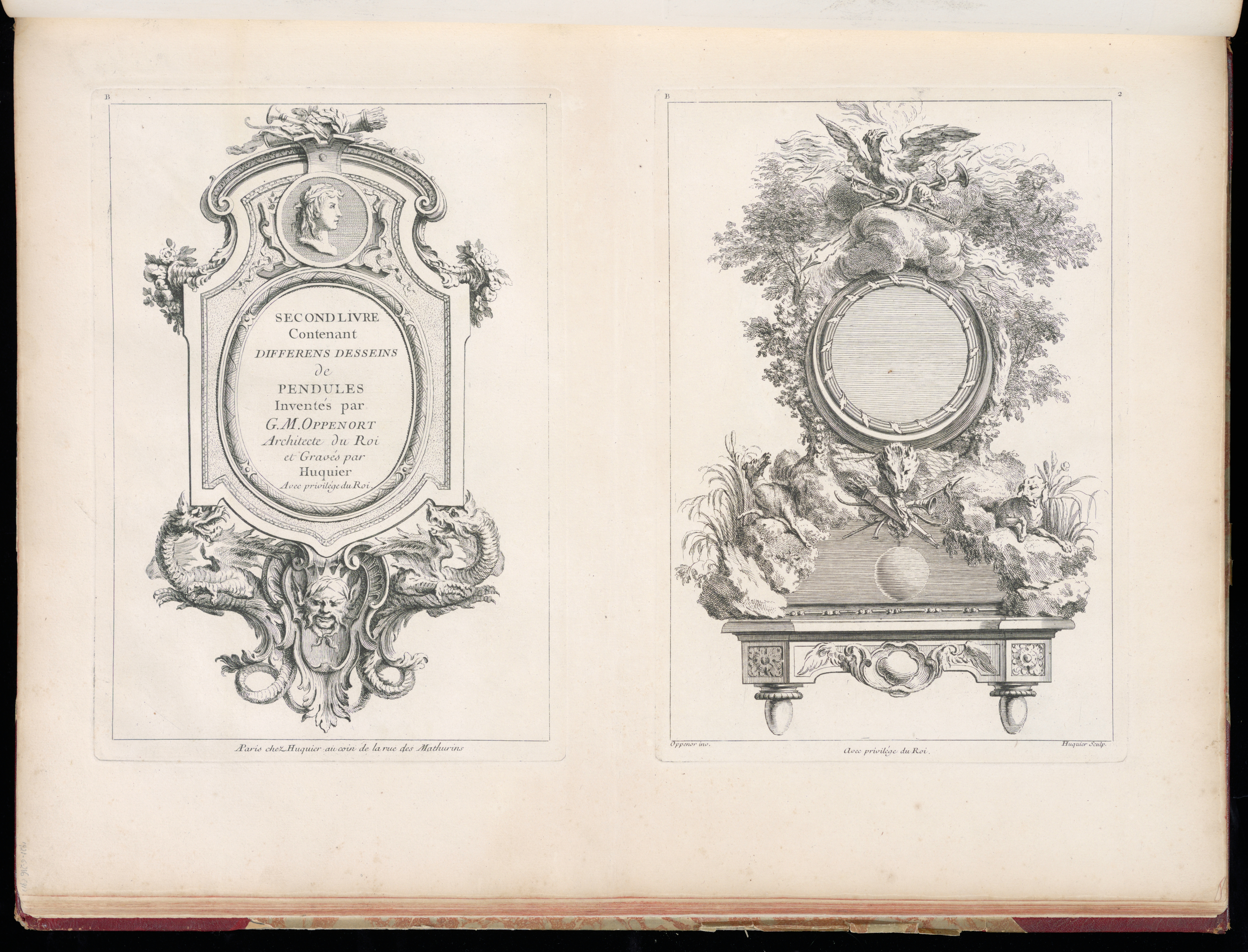 Left Plate: Printed upper left, in plate: B; Printed upper right, in plate: 1; Printed center, in plate: SECOND LIVRE / Contenant / DIFFERENS DESSEINS / de / PENDULES / Inventés par / G.M. OPPENORT / Architecte du Roi / et Gravés par / HUQUIER / Avec privilege du Roi.; Printed lower center, in plate: AParis chez Huquier au coin de la rue des Mathurins Right Plate: Printed upper left, in plate: B; Printed upper right, in plate: 2; Printed upper center, in plate: Avec privilége du Roi. Inscribed in graphite, lower left, in margin: 1921-6-216 (91)