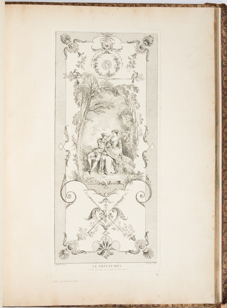 Bound Print, LE PRINTEMPS; Designed by Antoine Watteau (French, 1684 – 1721); Production directed by Jean de Jullienne (French, 1686–1766); Published by Laurent Cars (French, 1699–1771); Print Maker: François Boucher (French, 1703–1770); France; etching on laid paper; Purchased for the Museum by the Advisory Council; 1921-6-224-110