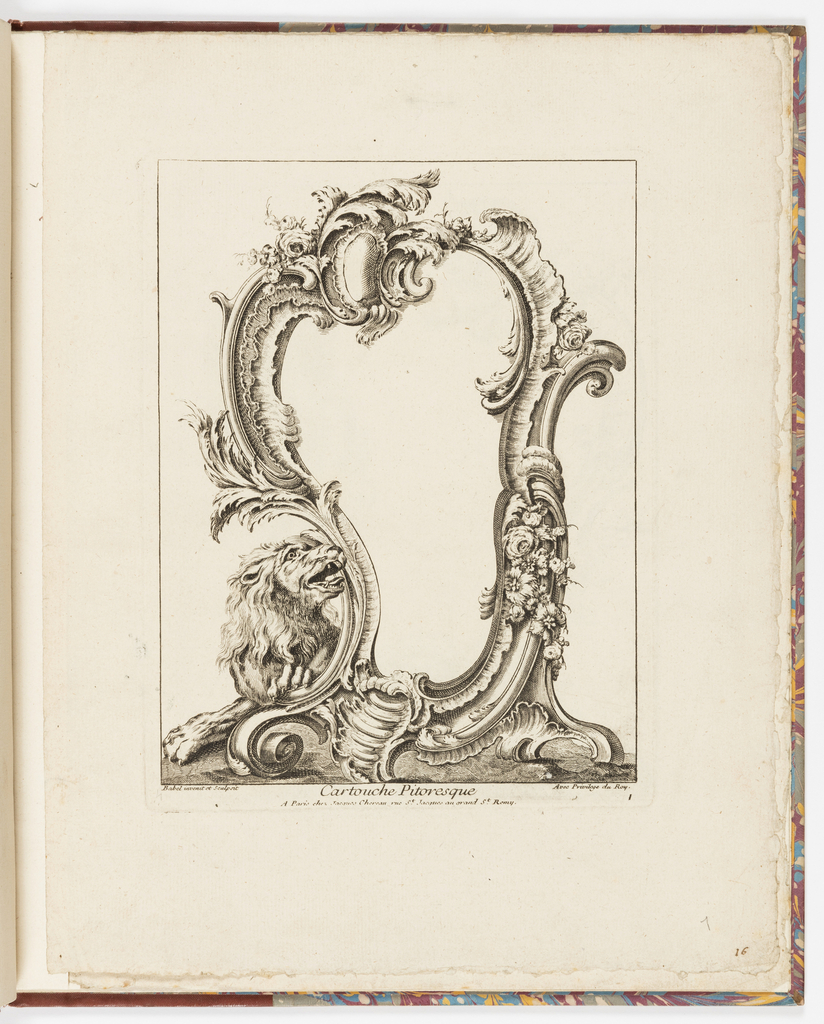 Printed lower center, in plate: Cartouche Pitoresque / A Paris chez Jacques Chereau rue St. Jacques au grand St. Remy.; Printed lower right, in plate: Avec Privilege du Roy / 1; Inscribed in graphite, lower right, in margin: 7; Inscribed in ink, lower right, in margin: 16