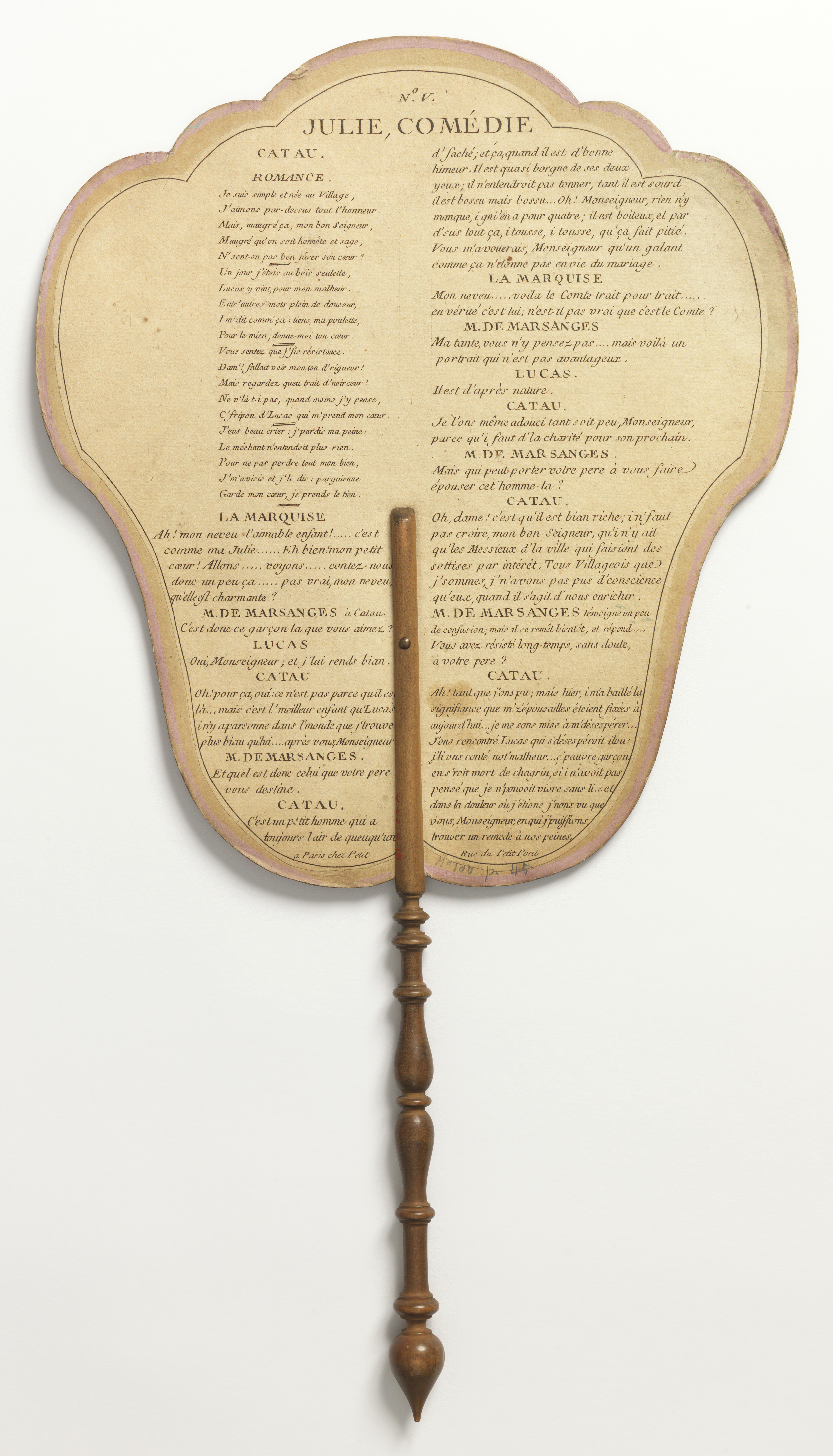 Handscreen (France); engraved, hand-colored and painted paper leaf, turned wood handle; H x W: 45.1 x 24.7 cm (17 3/4 x 9 3/4 in.); Purchased for the Museum by the Advisory Council; 1921-6-24-a