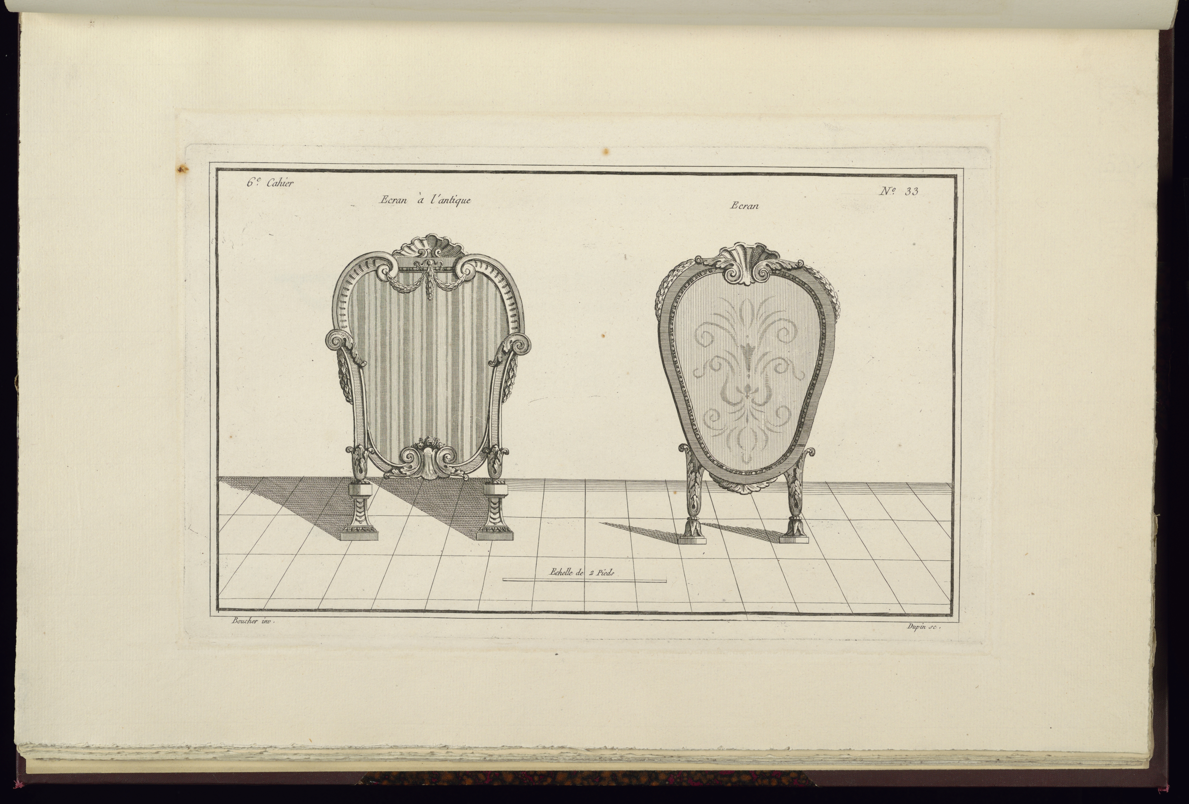 Printed upper left, in plate: 6e. Cahier; Printed upper left, in plate: Ecrans à l'antique; Printed upper right, in plate: Ecran; Printed upper right, in plate: No. 33
