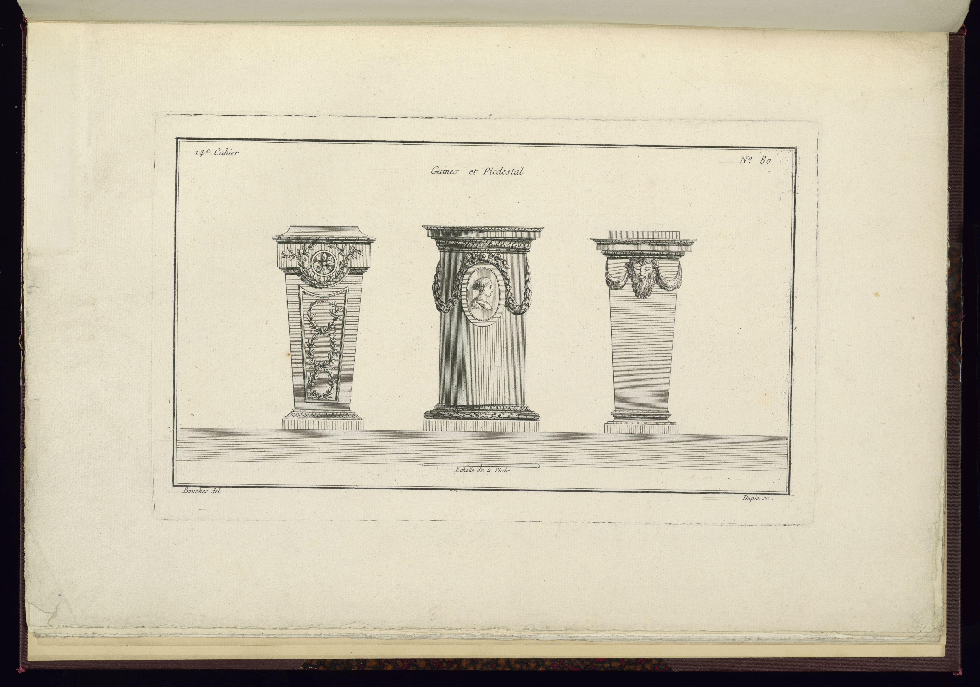 Print, Gaines et Piedestal; Designed by Jules-François Boucher le fils (French, 1736 – 1782); Print Maker: Nicolas Dupin (French, active 18th century); Published by Chez Le Pere et Avaulez, Charles Le Pere (French, active 18th century), Pierre-Michel Avaulez (French, active 1772 – d. 1774); France; engraving on off white laid paper; Purchased for the Museum by the Advisory Council; 1921-6-252-75