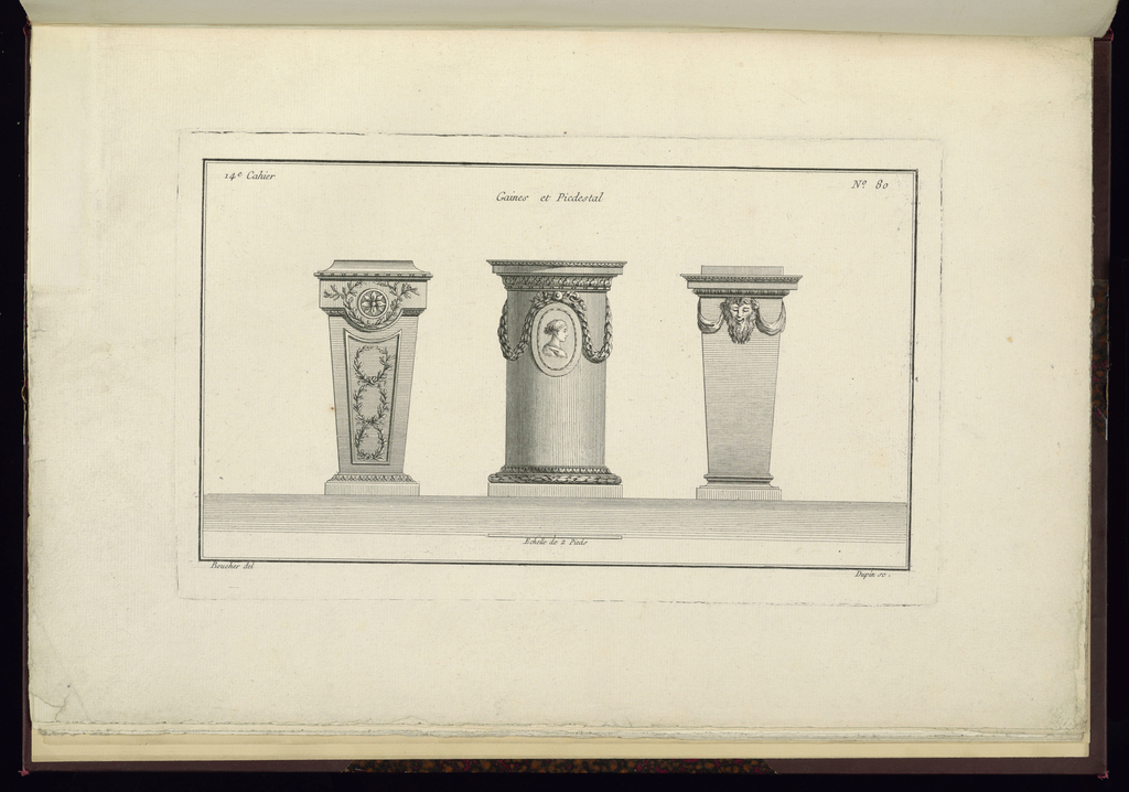 Printed upper left, in plate: 14e. Cahier; Printed upper center, in plate: Gaines et Piedestal; Printed upper right, in plate: No. 80