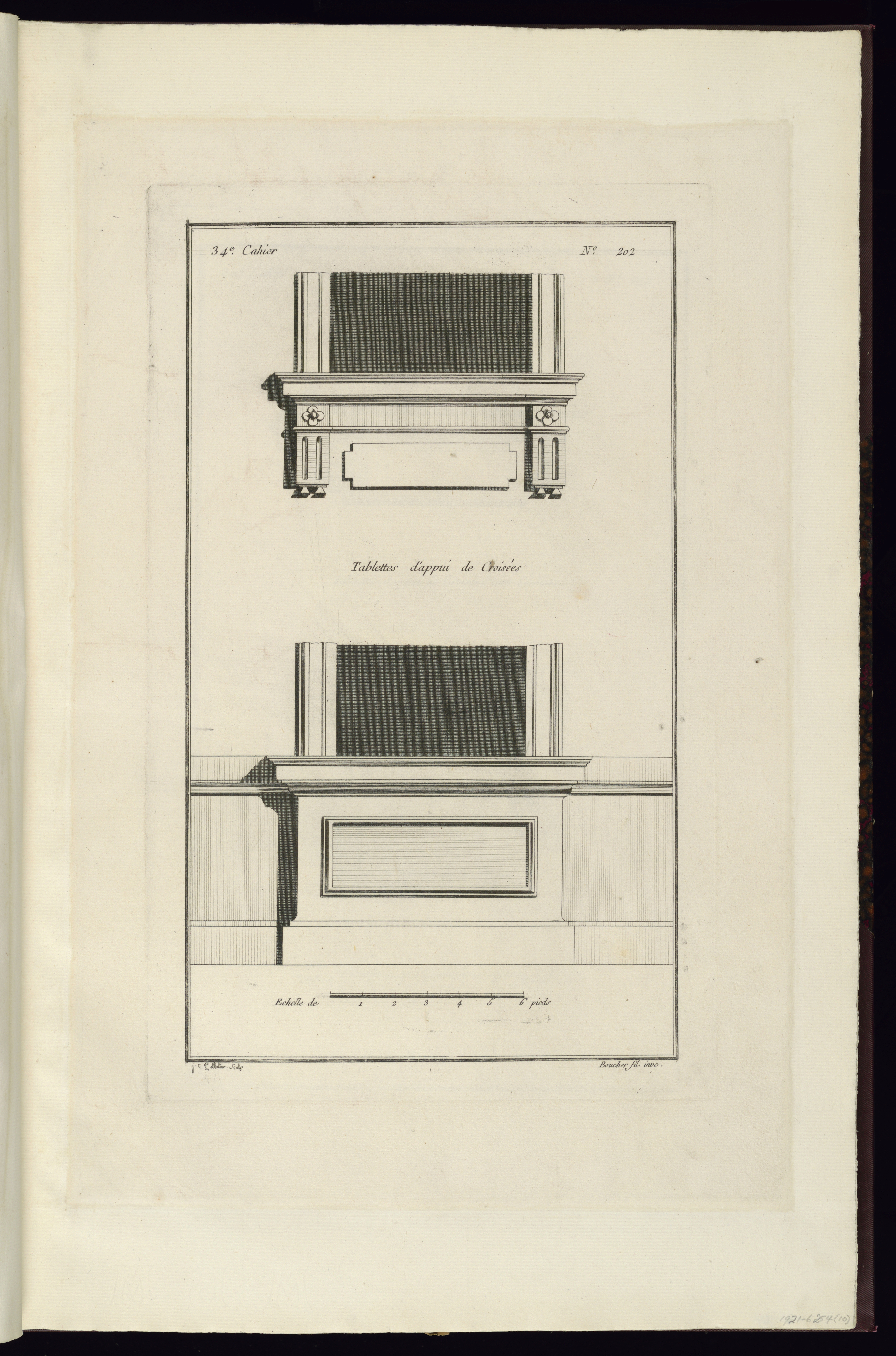 Printed upper left, in plate: 34e. Cahier; Printed upper right, in plate: No. 202; Printed center, in plate: Tablettes d'appui de Croisées; Inscribed in graphite, lower right, in margin: 1921-6-254 (10)