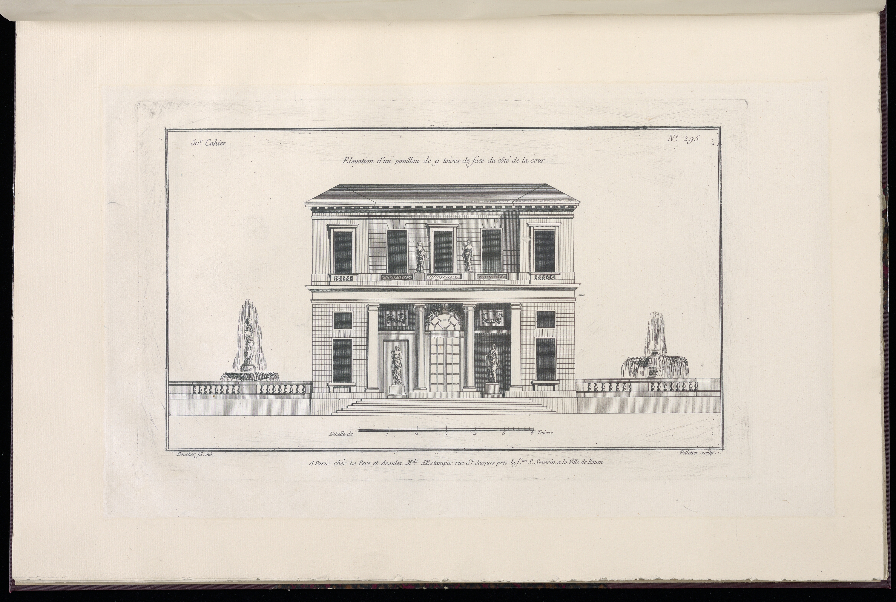 Printed upper left, in plate: 50e. Cahier; Printed upper center, in plate: Elevation d'un pavillon de 9 toises de face du côté de la cour; Printed upper right, in plate: No. 295; Printed lower center, in plate: A Paris chés Le Pere et Avaulez Mds. d'Estampes rue St. Jacques pres la fne. S. Severin a la Ville de Rouen
