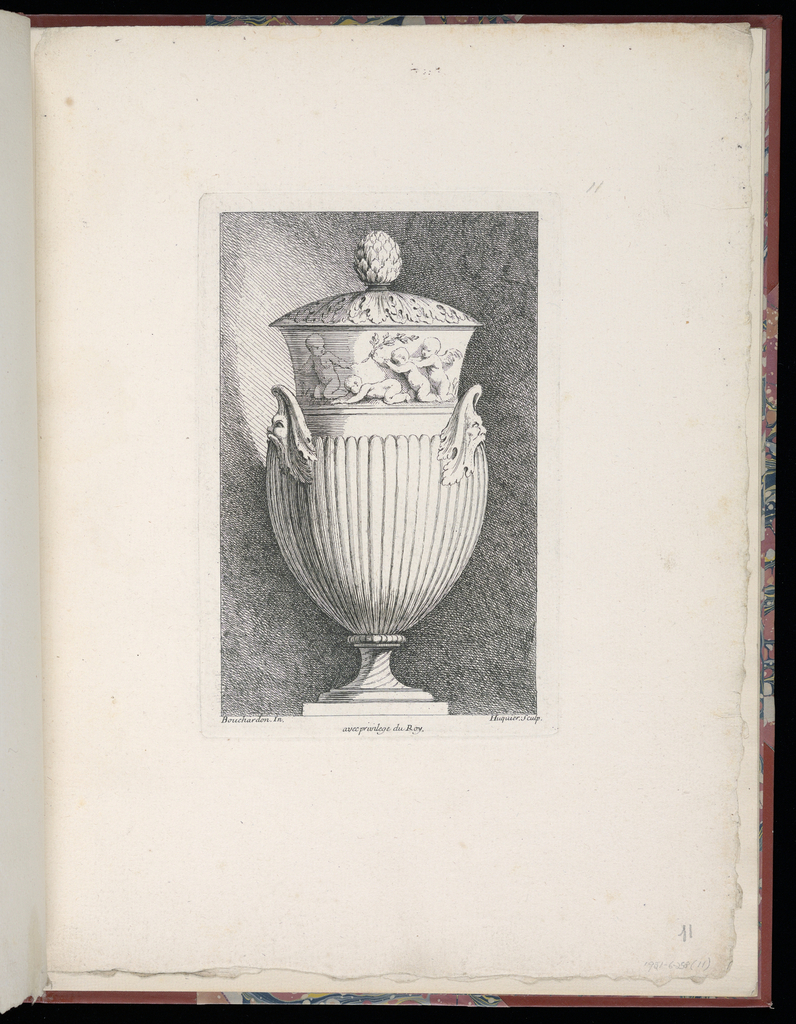 Print, Ornamental Vase Design; Designed by Edmé Bouchardon (French, active Rome and France, 1698 - 1762); Print Maker: Gabriel Huquier (French, 1695–1772); Published by Chez Huquier; France; etching on laid paper; Purchased for the Museum by the Advisory Council; 1921-6-258-11