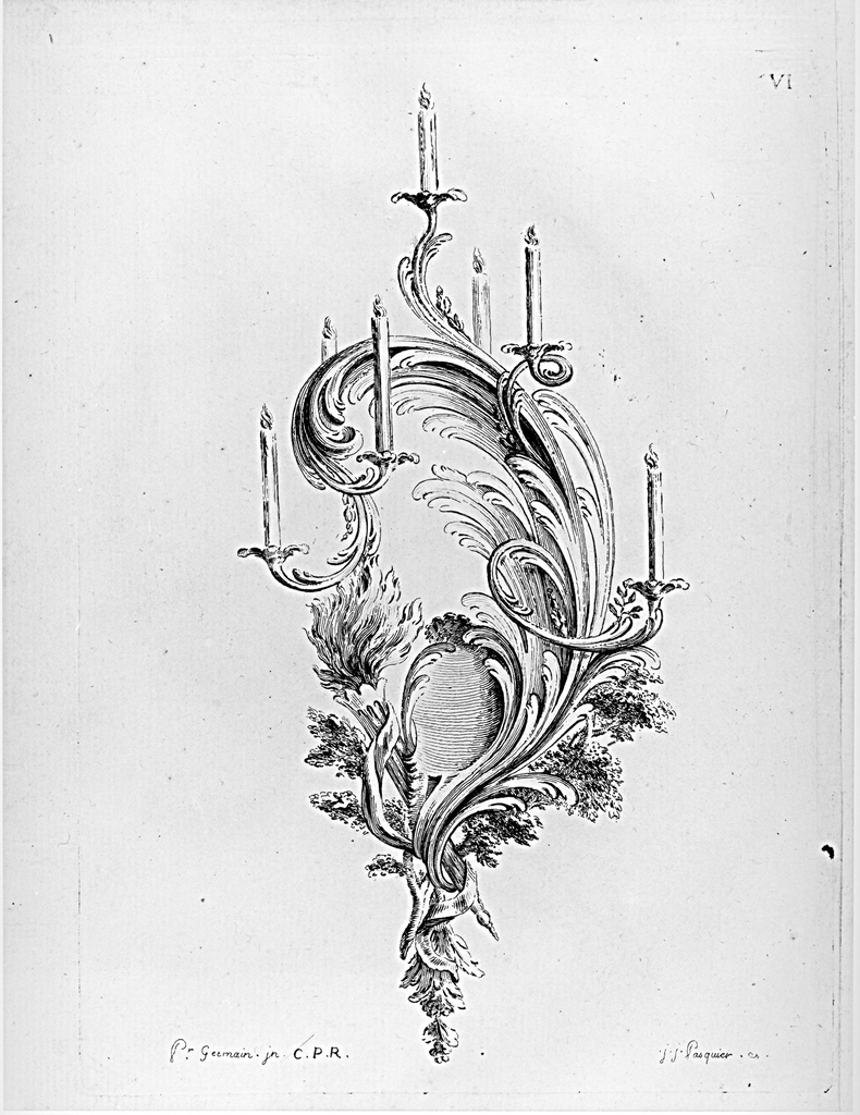 Print, Ornament Design with Candles; Designed by Pierre Germain (French, 1703 - 1783); Print Maker: Jean Jacques Pasquier (French, died 1785); France; engraving on laid paper; Purchased for the Museum by the Advisory Council; 1921-6-259-5