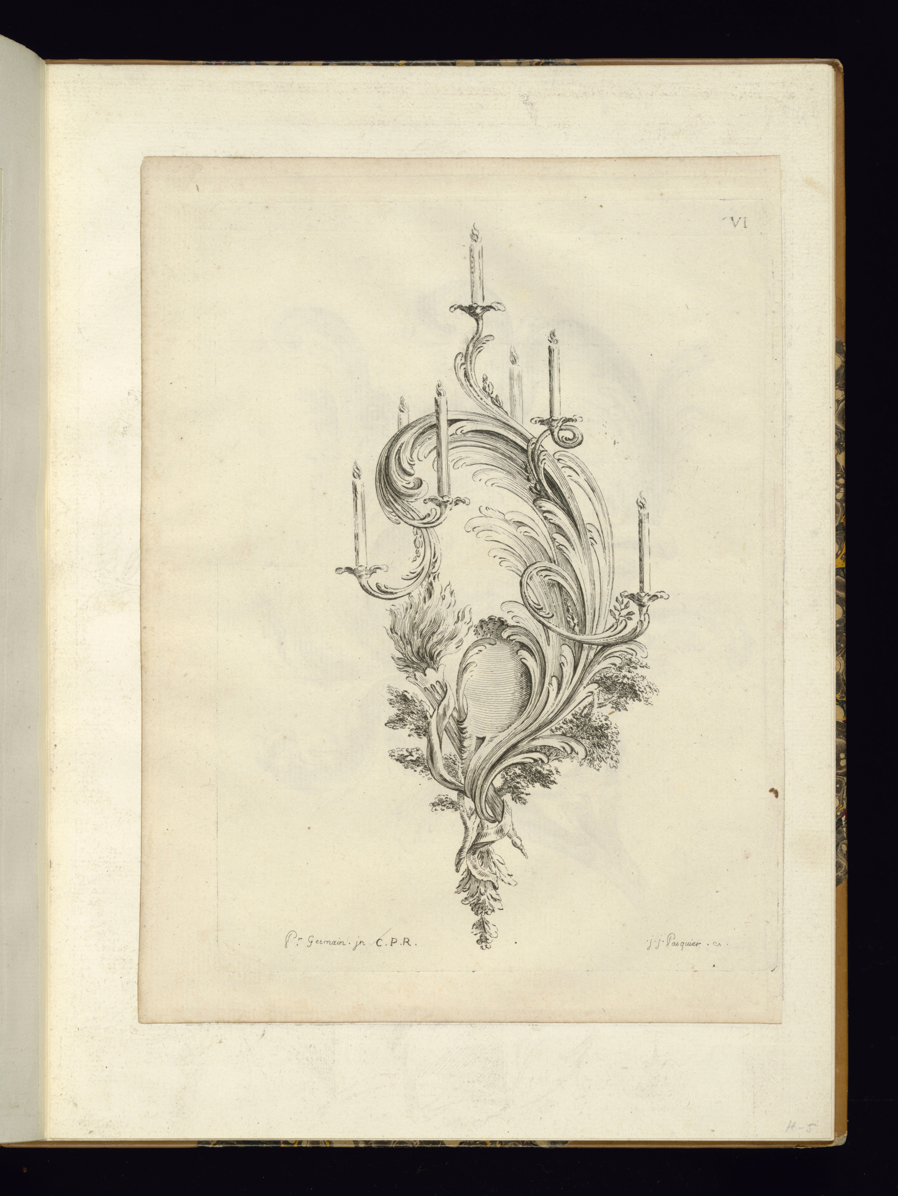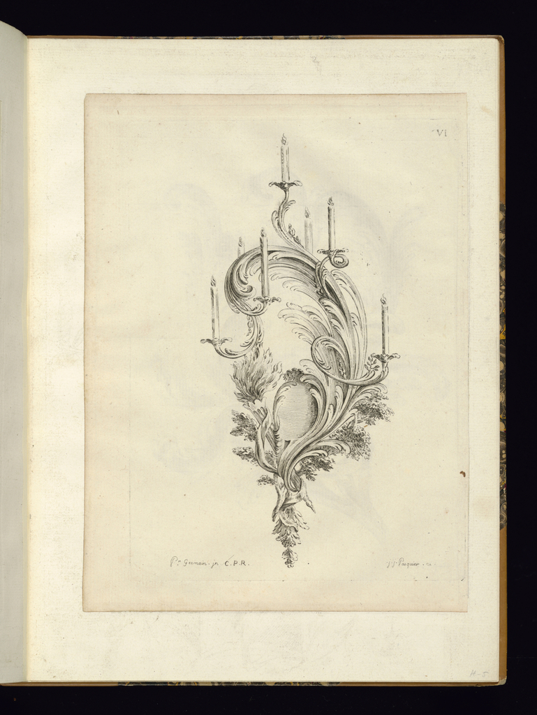 Print, Ornament Design with Candles; Designed by Pierre Germain (French, 1703 - 1783); Print Maker: Jean Jacques Pasquier (French, died 1785); France; engraving on laid paper; Purchased for the Museum by the Advisory Council; 1921-6-259-5