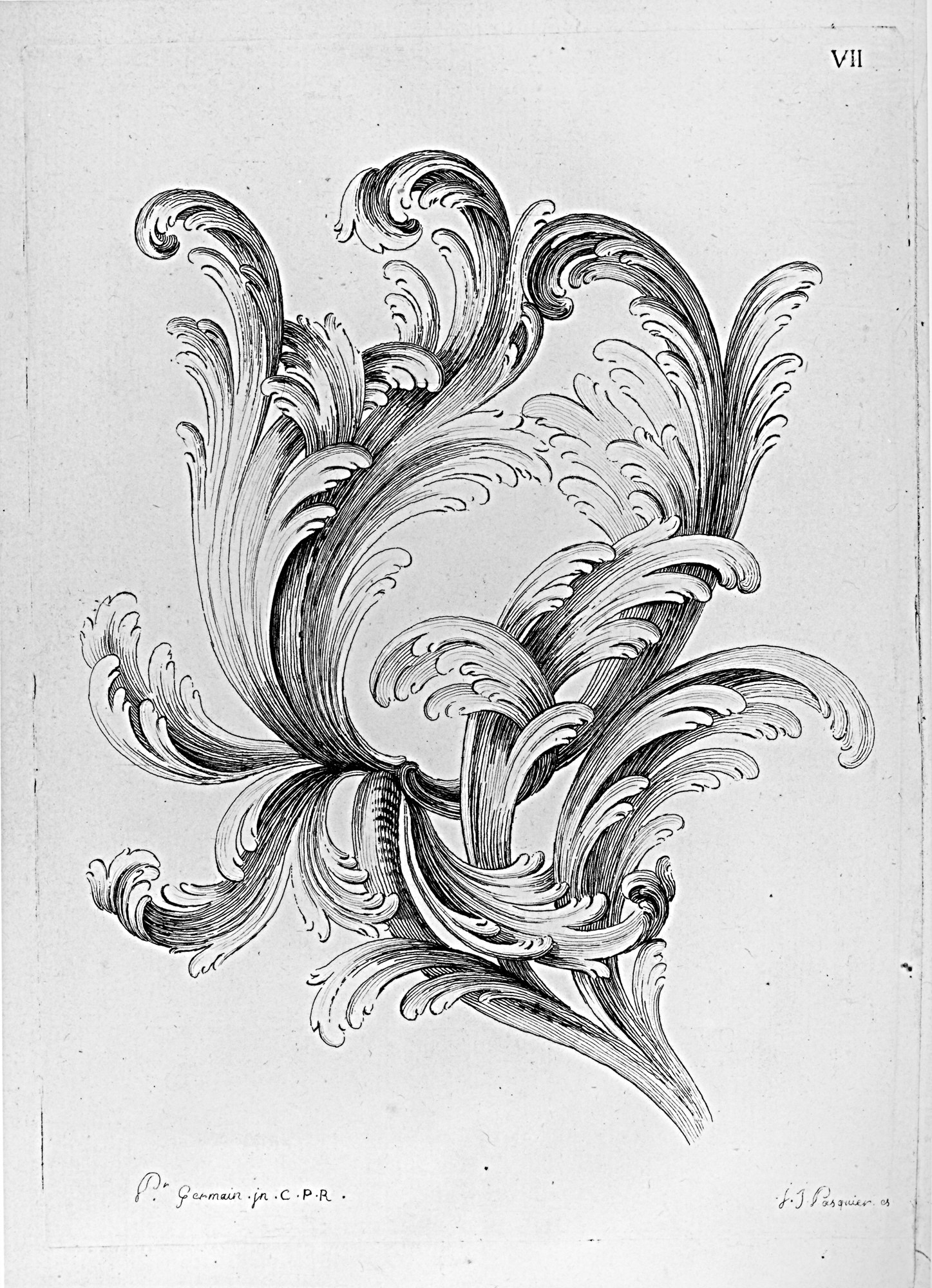 Print, Ornament Design; Designed by Pierre Germain (French, 1703 - 1783); Print Maker: Jean Jacques Pasquier (French, died 1785); France; engraving on laid paper; Sheet: 24.8 x 18.3 cm (9 3/4 x 7 3/16 in.); Purchased for the Museum by the Advisory Council; 1921-6-259-6