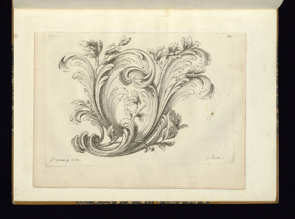 Print, Design for Ornament; Designed by Pierre Germain (French, 1703 - 1783); Print Maker: Jean Jacques Pasquier (French, died 1785); France; engraving on laid paper; Sheet: 24.8 x 18.3 cm (9 3/4 x 7 3/16 in.); Purchased for the Museum by the Advisory Council; 1921-6-259-8