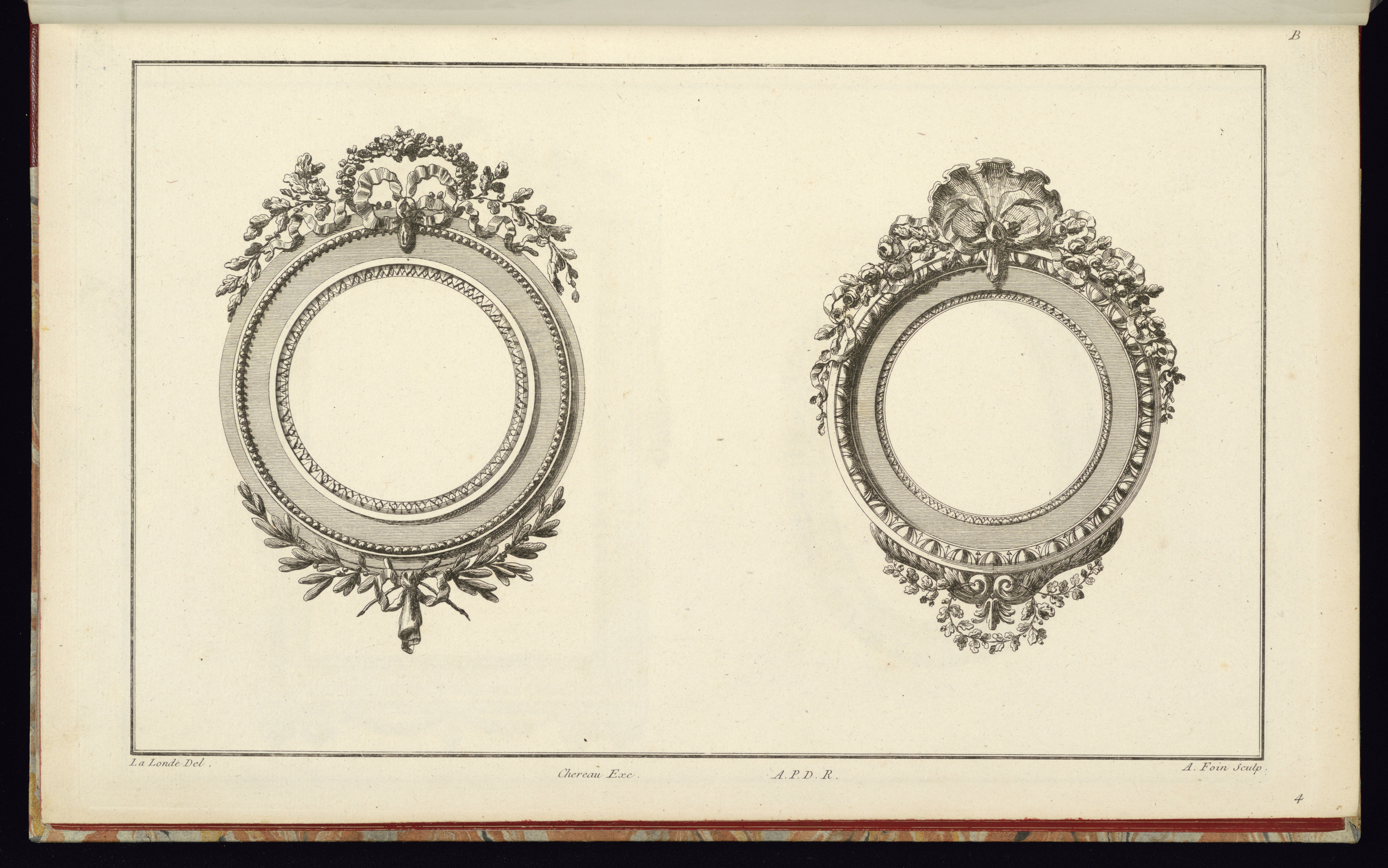 Print, Two Frame Designs; Designed by Richard de Lalonde (French, active 1780–96); Print Maker: Augustin Nicolas Foin (French, 1726–c. 1759); Published by Jacques-François Chéreau (French, 1742 - 1794); France; etching on off-white laid paper; Purchased for the Museum by the Advisory Council; 1921-6-278-11