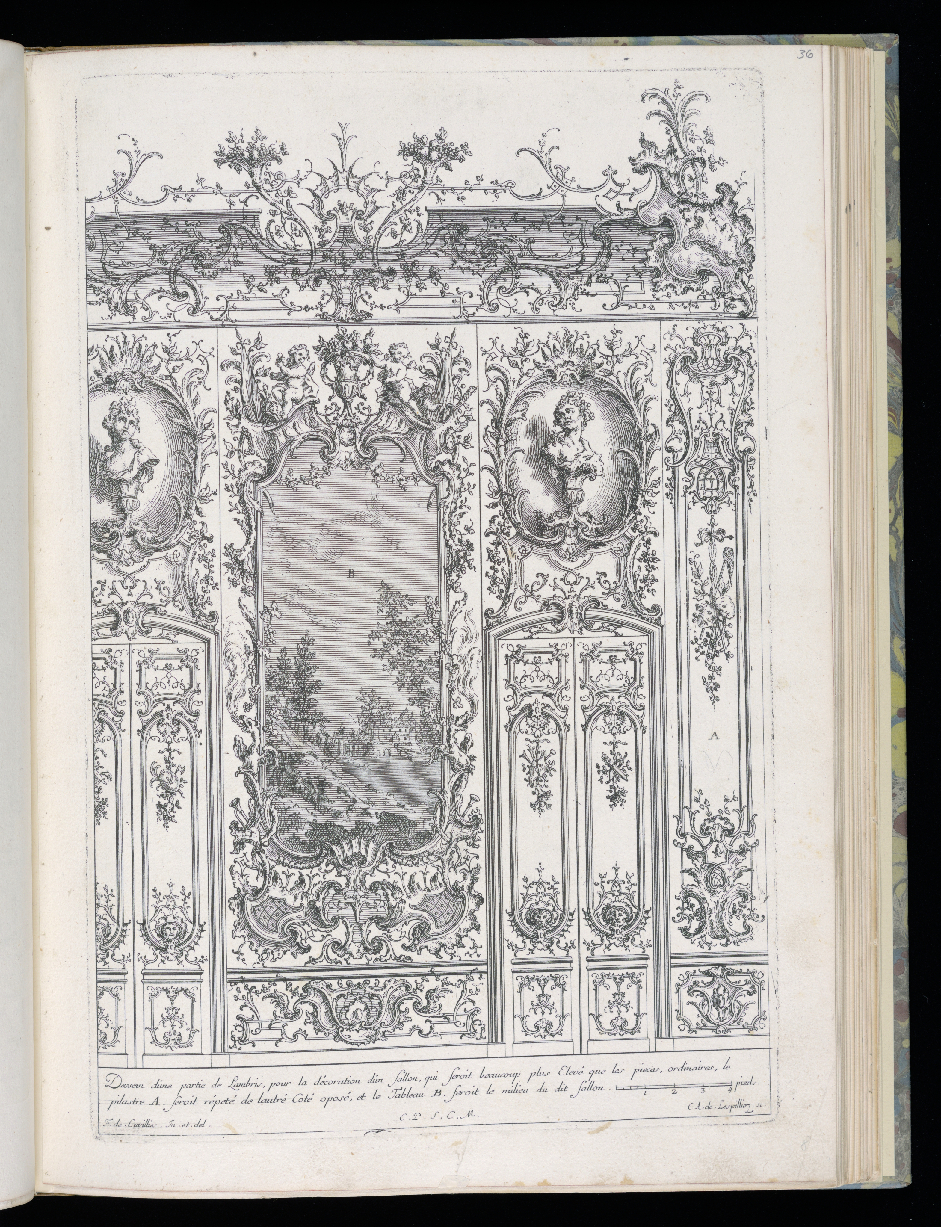 Printed in plate, lower center: Dessein d'une partie de Lambris, pour la décoration d'un sallon, qui seroit beaucoup plus Elevé que les pieces, ordinaires, le pilastre A. seroit répeté de lautre Coté oposé, et le Tableau B. seroit le milieu du dit sallon.; lower center: C. P. S. C. M.; inscribed in graphite, upper right, in margin: 36