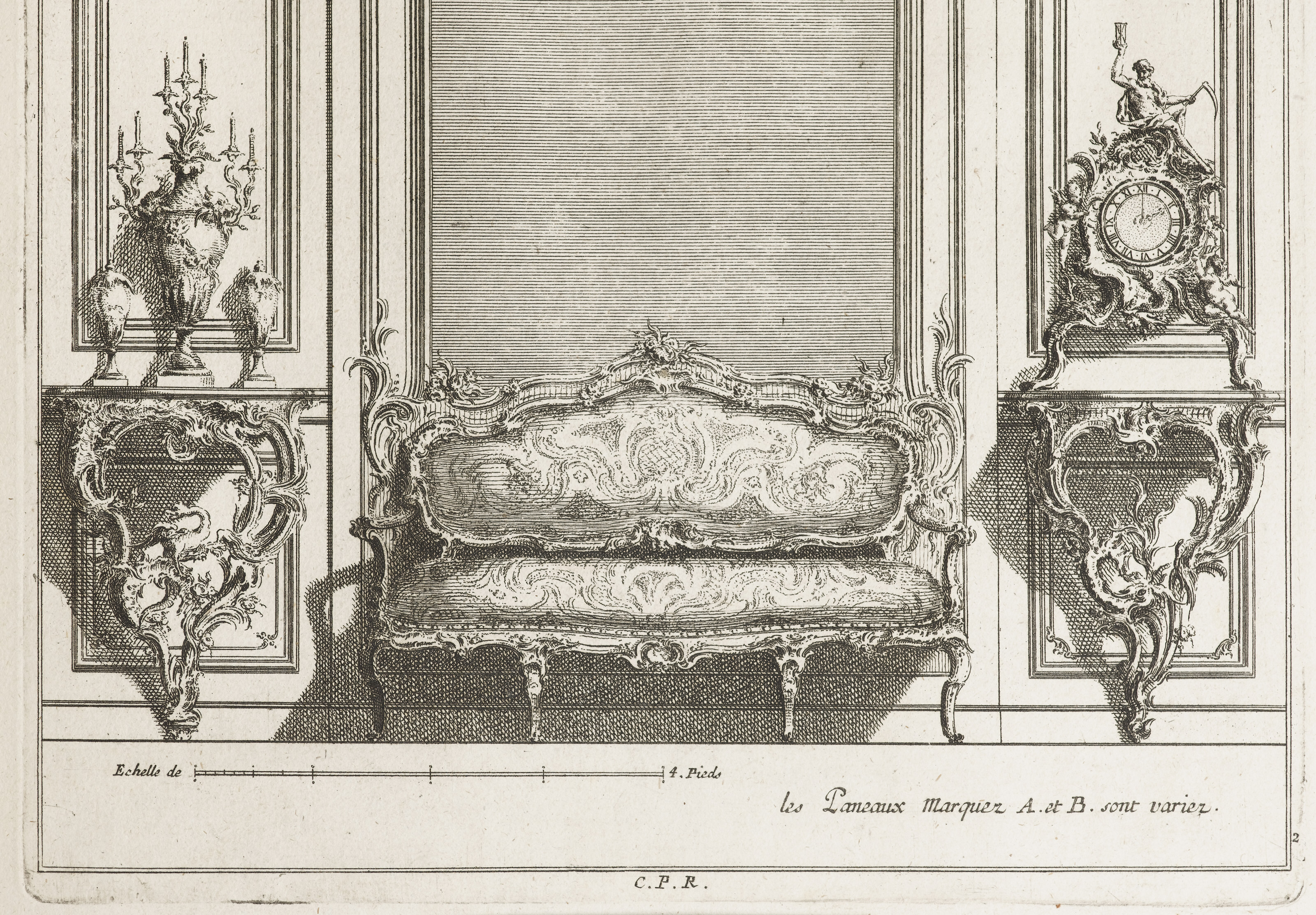 Inscribed in plate, upper margin: C. P. S. C. M. / Decoration de Lambris pour un Cabinet, oû il y a un Canapé audessous de la Glace.; lower margin: Echelle de [scale] 4. Pieds.; lower right: les Paneaux marquez A. et B. son variez.; lower center: C. P. R.