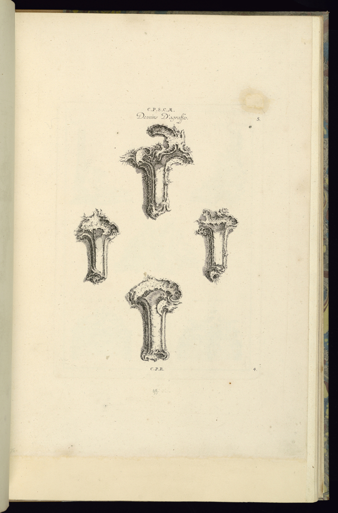 Printed upper center, in plate: C.P.S.C.M. / Desseins D'agraffes.; Printed upper right, in plate: S; Printed lower center, in plate: C.P.R.; Printed lower right, in plate: 4; Inscribed in graphite, lower right, in margin: 96.