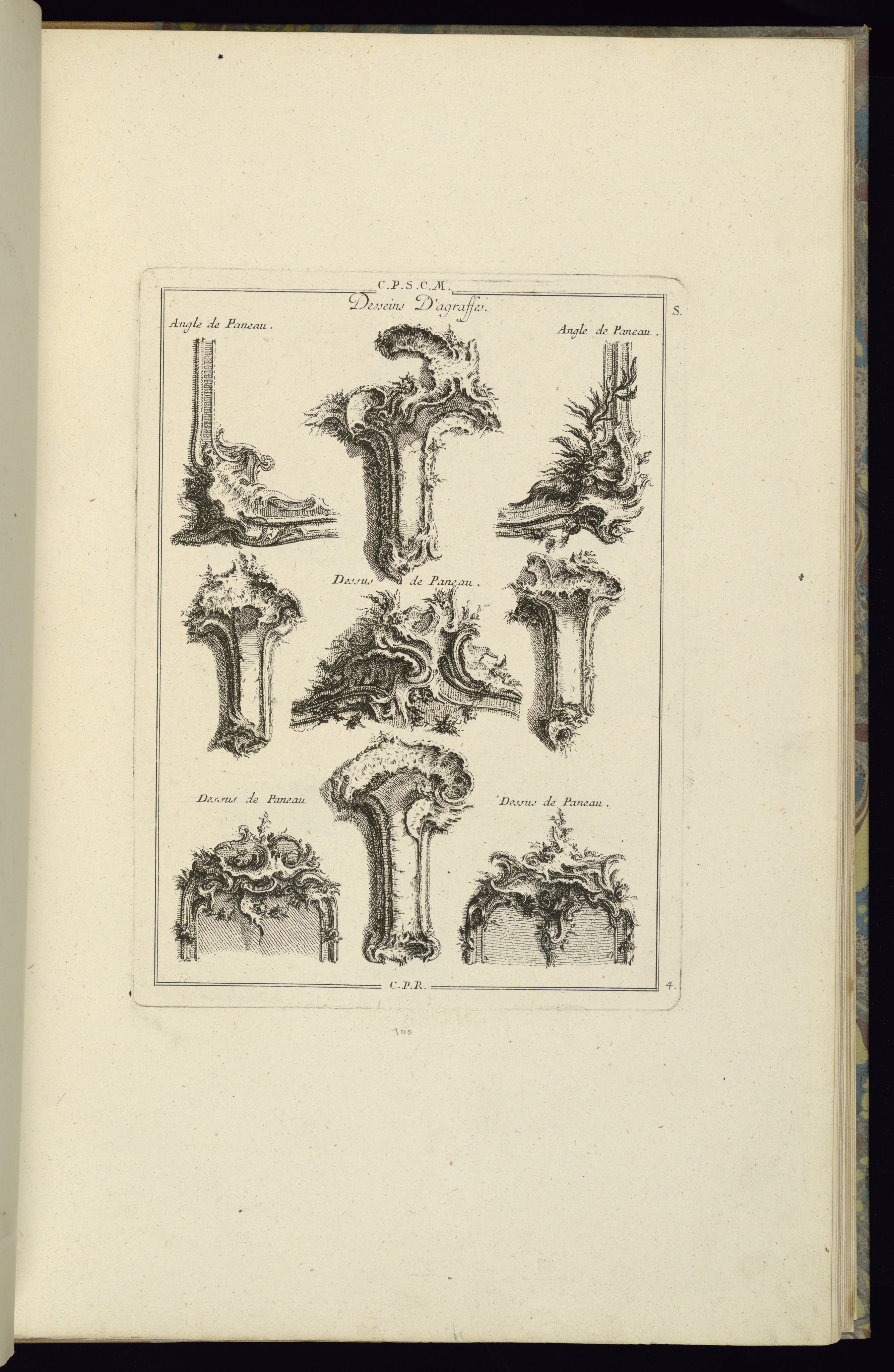 Printed upper center, in plate: C.P.S.C.M. / Desseins D'agraffes.; Printed upper right, in plate: S; Printed lower center, in plate: C.P.R.; Printed lower right, in plate: 4