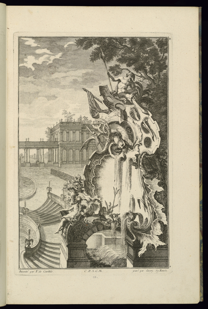 On plate, upper right: B; lower left: Inventé par F. de Cuvilliés; lower center: C.P.S.C.M.; lower right: gravé par Georg Sig. Roesch/4
