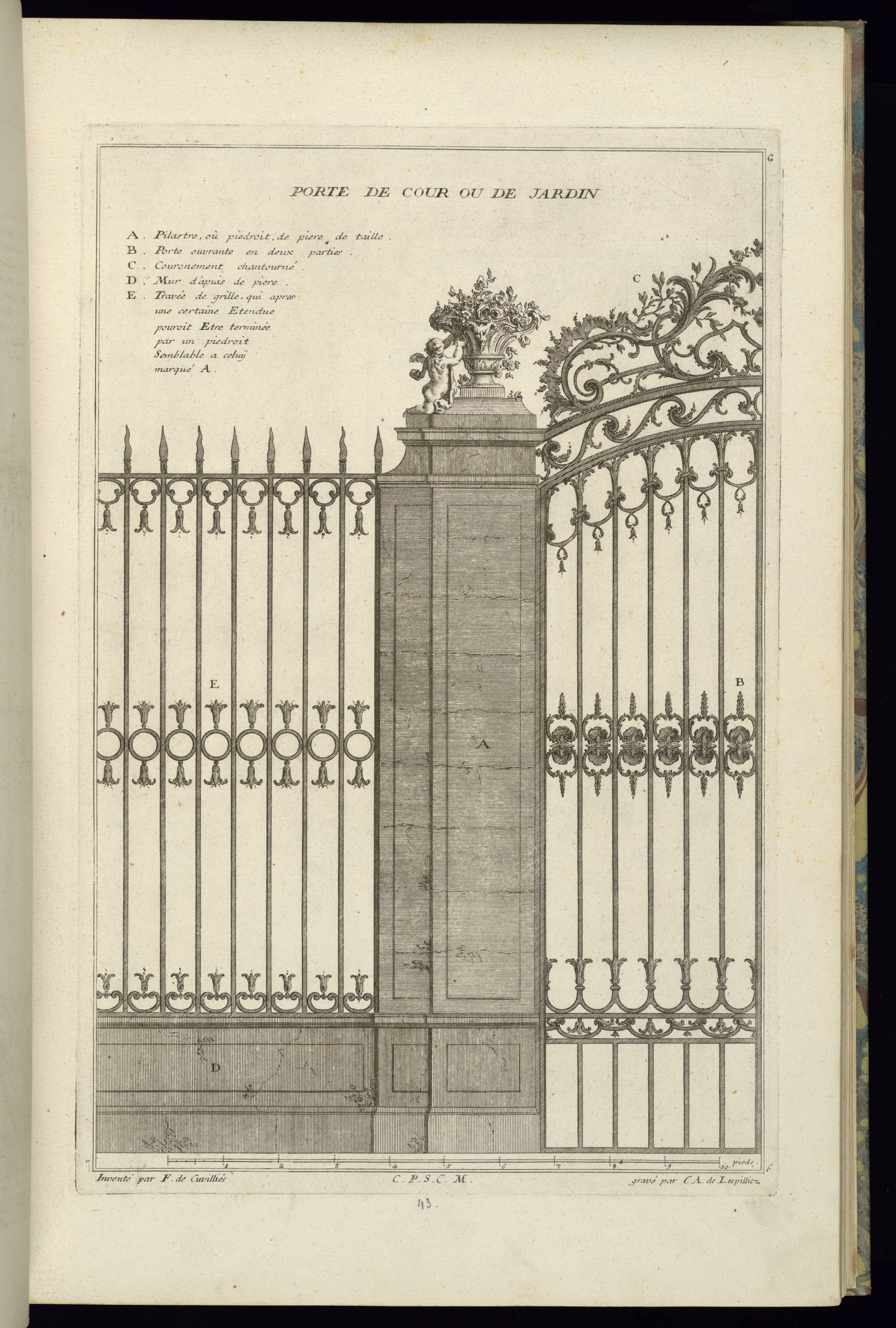 Printed upper center, in plate: PORTE DE COUR OU DE JARDIN; Printed upper right, in plate: G; Printed lower center, in plate: C.P.S.C.M.; Printed lower right, in plate: 6; Inscribed in graphite, lower center, in margin: 43-