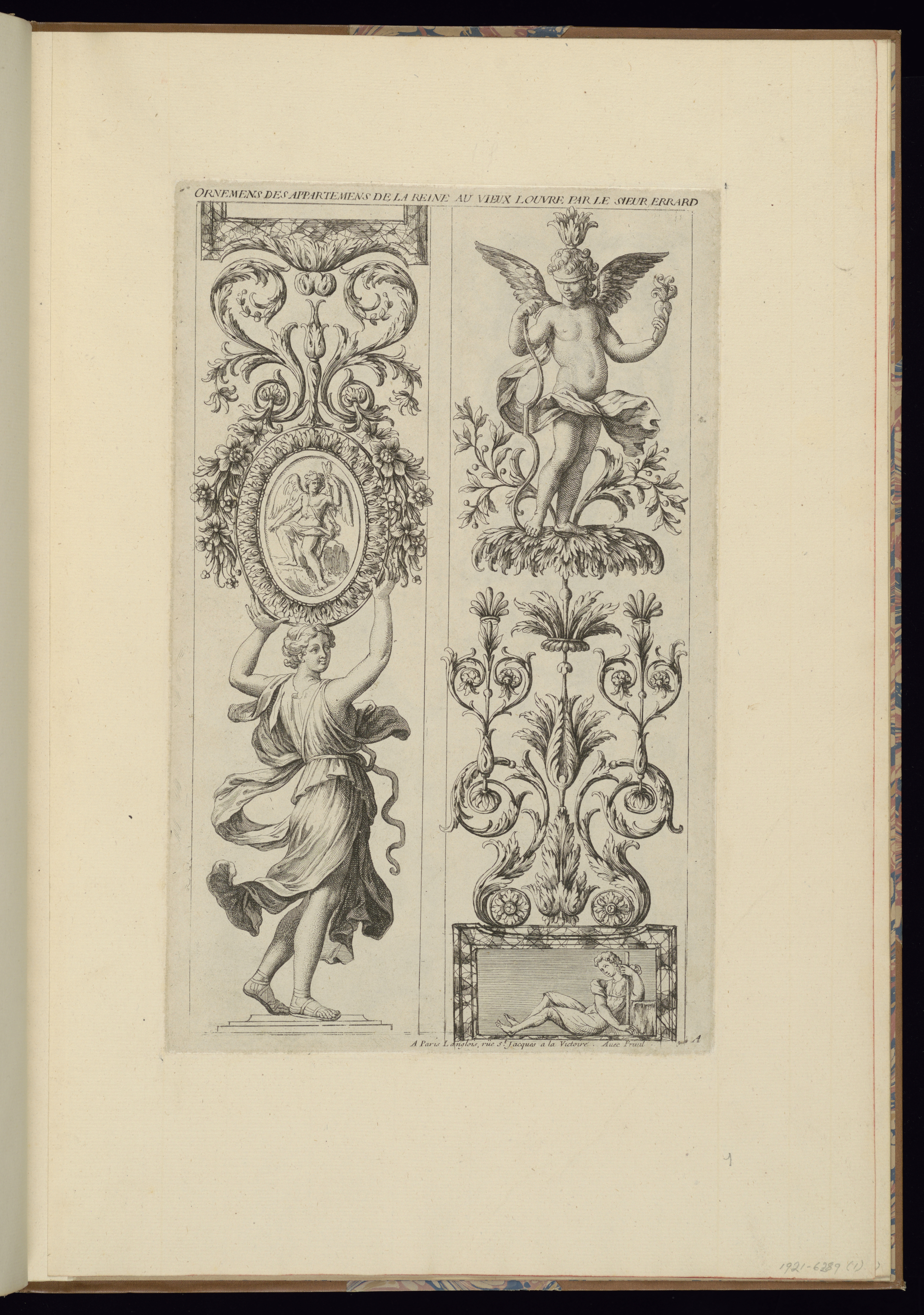 Printed upper center, in plate: ORNEMENS DES APPARTEMENS DE LA REINE AU VIEUX LOUVRE PAR LE SIEUR ERRARD; Printed lower center-right, in plate: A Paris Langlois, rüe St. Jacques a la Victoire . Avec Privil. Printed lower right, in plate: A; Inscribed in graphite, lower right, in margin: 1 / 1921-6-289(1)