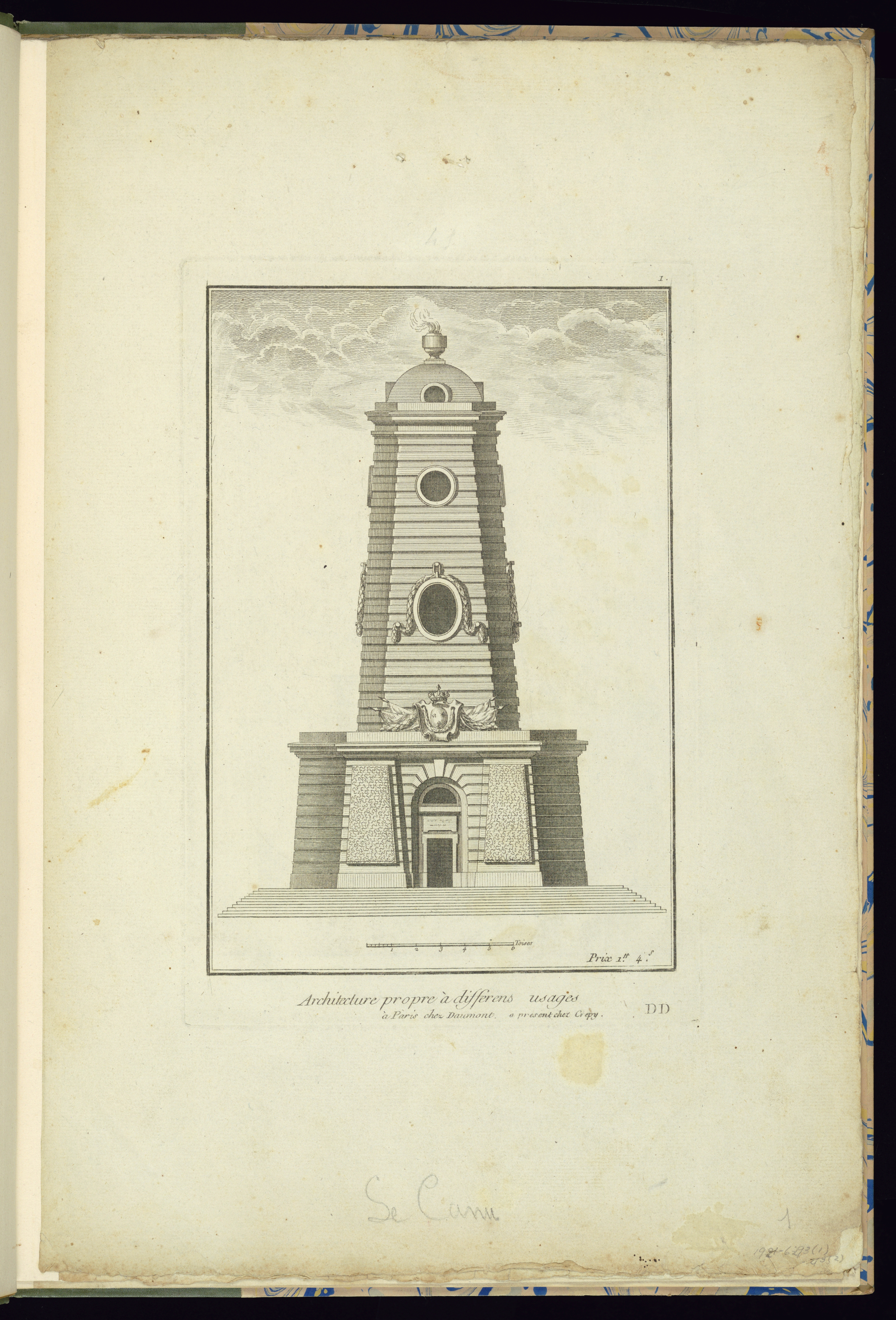 Numbered in plate, upper right: 1; lettered lower center: 1 2 3 4 5 6 Toises; lettered lower right: Prix 1.h. 4.s.; lettered lower center below frame: Architecture propre à differens usages; lettered lower right: DD; inscribed in graphite lower right margin: 1/ 1921-6-293(1); inscribed in graphite lower center margin: Le Canu