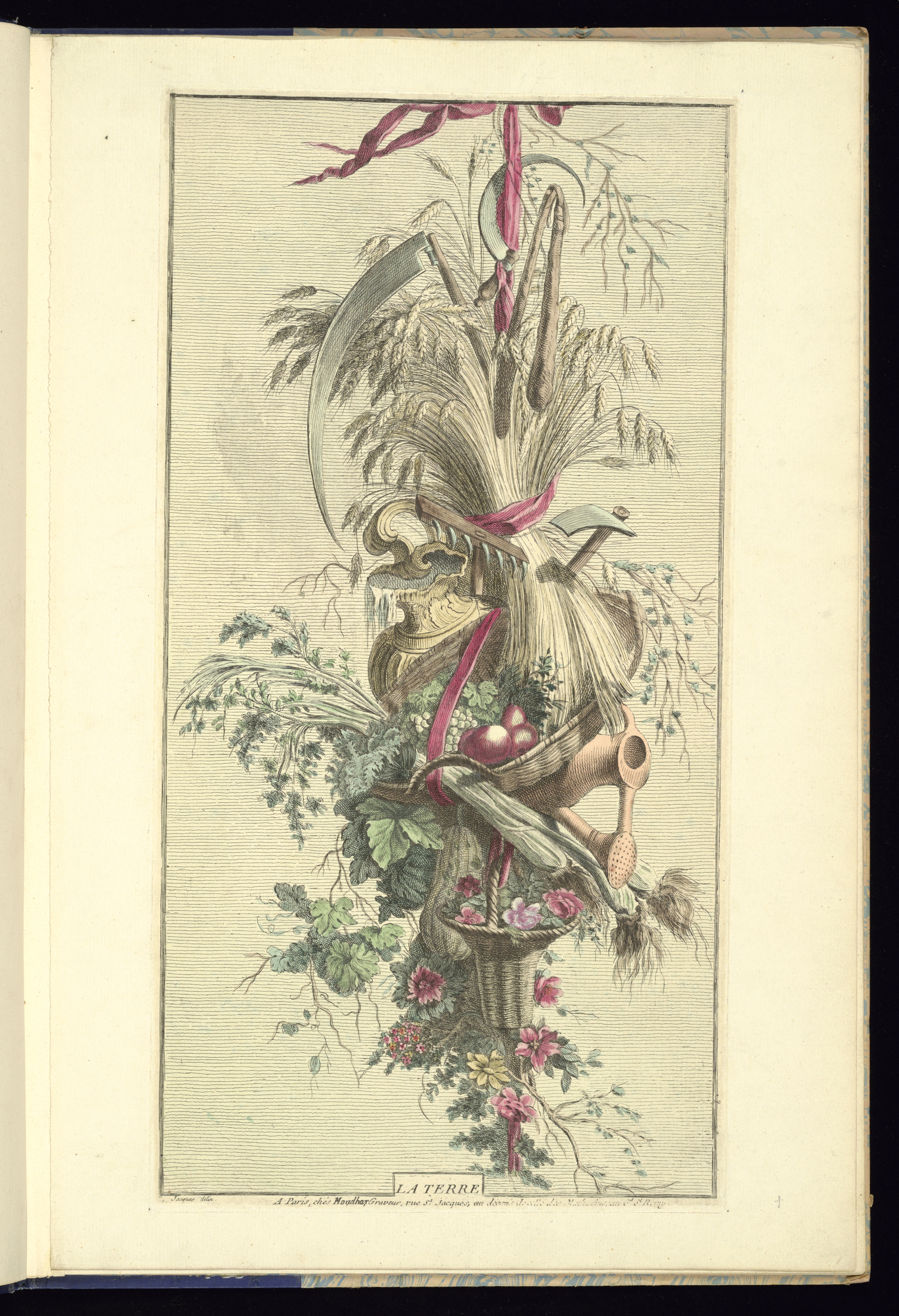 Print, La Terre; Designed by Maurice Jacques; Published by Jacques-Gabriel Huquier (French, 1730 - 1805); Retailed by Louis-Joseph Mondhare (French, 1734–1799); France; hand-colored etching and engraving on paper; Purchased for the Museum by the Advisory Council; 1921-6-299-1