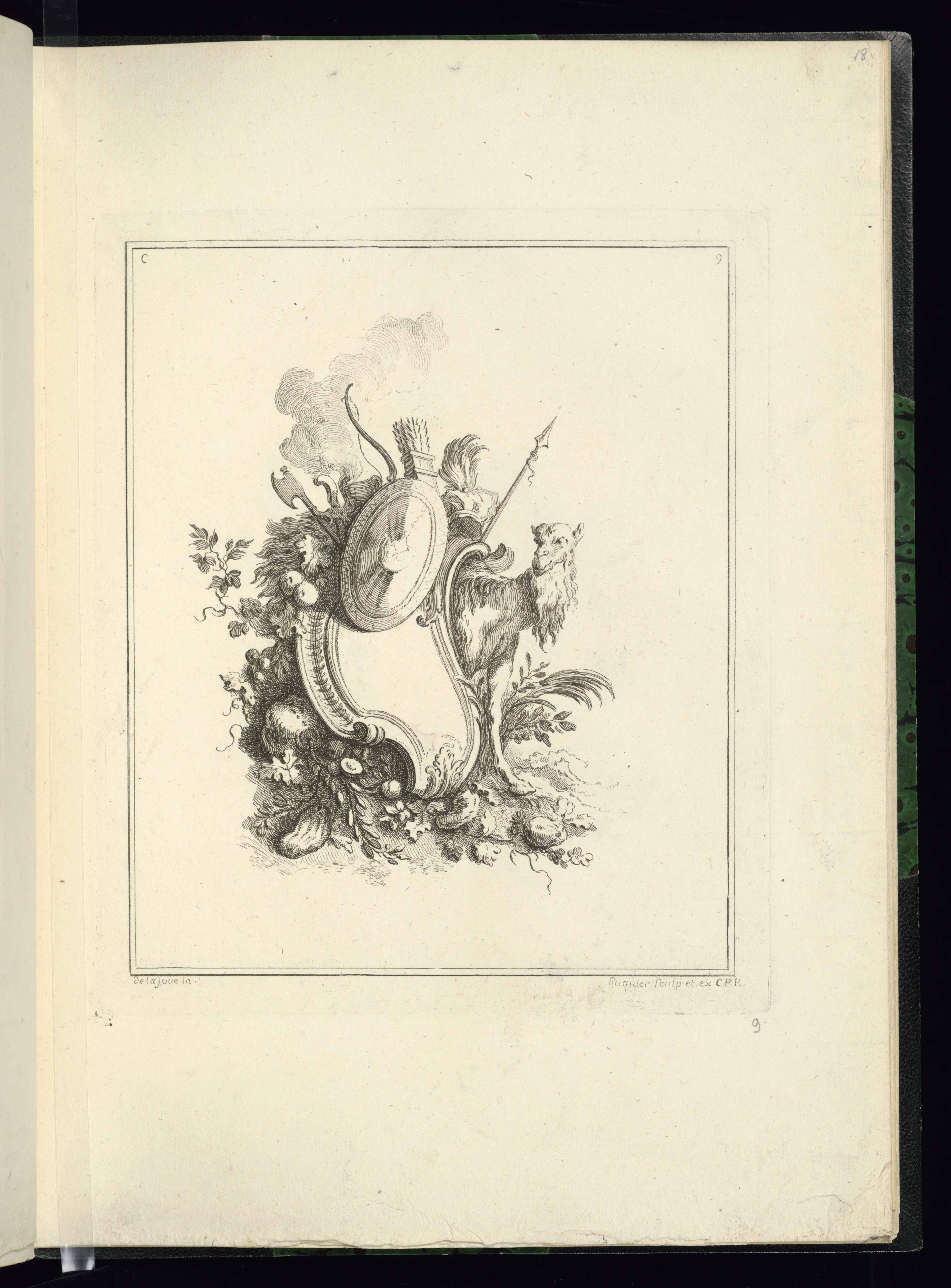 On plate, upper left: c; upper right: 9; lower left: De la joue in.; lower right: huquier Sculp. et ex. C.P.R.; on sheet, upper right: 18; lower right: 9