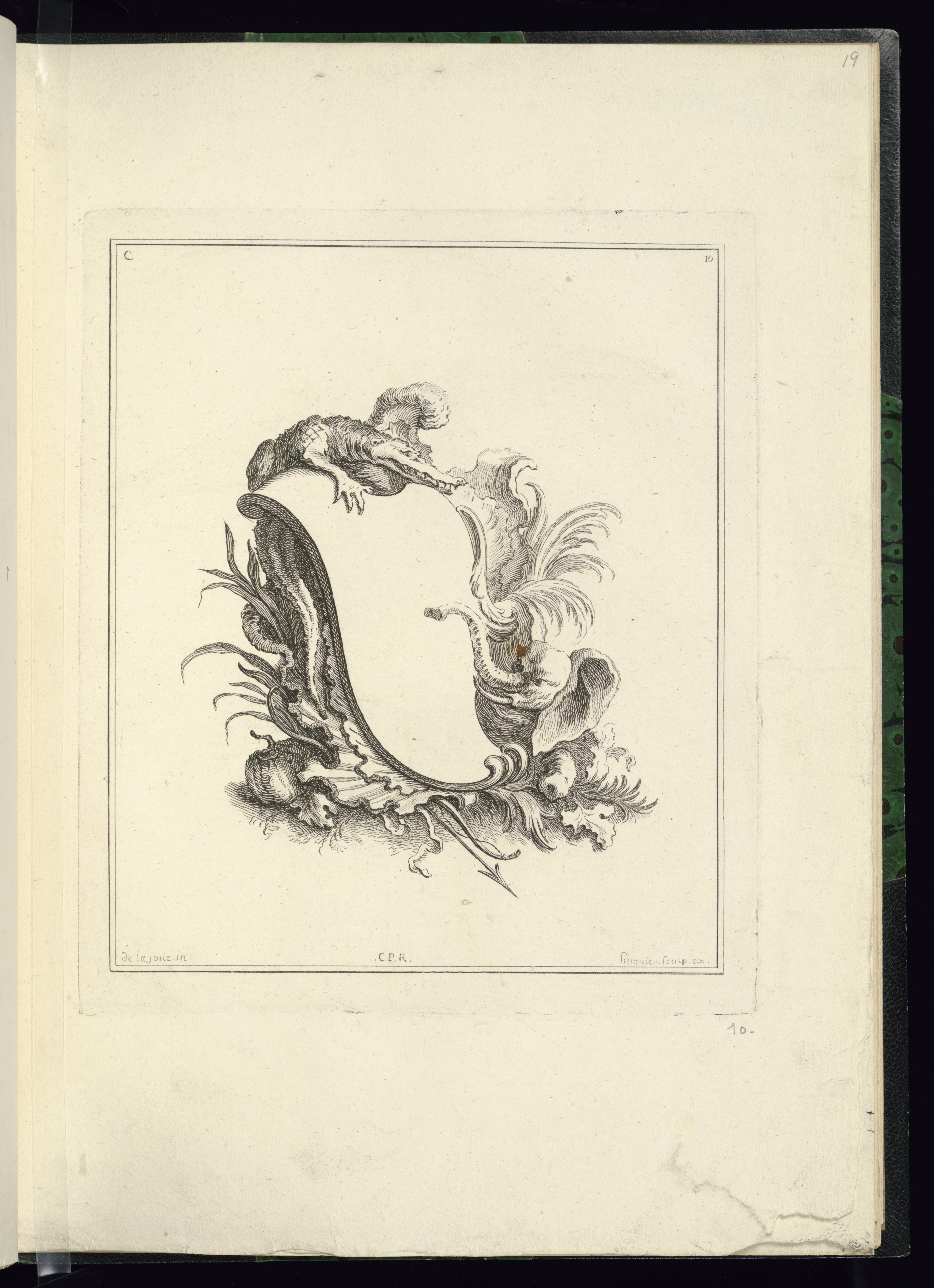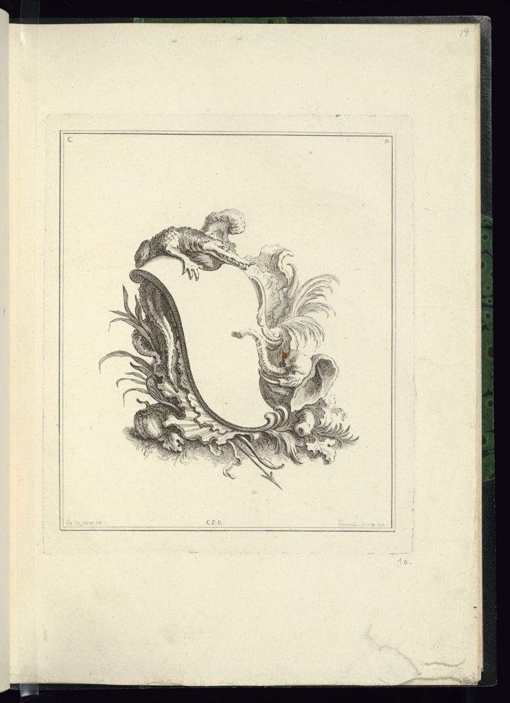 On plate, upper left: c; upper right: 10; lower left: De la Joue inv.; lower center: C.P.R.; lower right: huquier sculp. ex.; on sheet, upper right: 19; lower right: 10