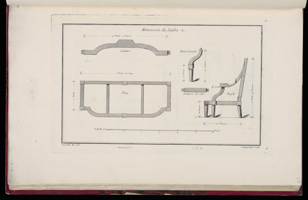 Printed upper center, in plate: Menuiserie du Sopha A.; Printed upper right, in plate: G; Printed lower center, in plate: Chereau Exc. C.P.R.; Printed lower right, in plate: 2; Inscribed in graphite, upper left, in margin: 38; Inscribed in graphite, lower left, vertically, in margin: 1921-6-331 (39); Inscribed in graphite, lower right, in margin: 39