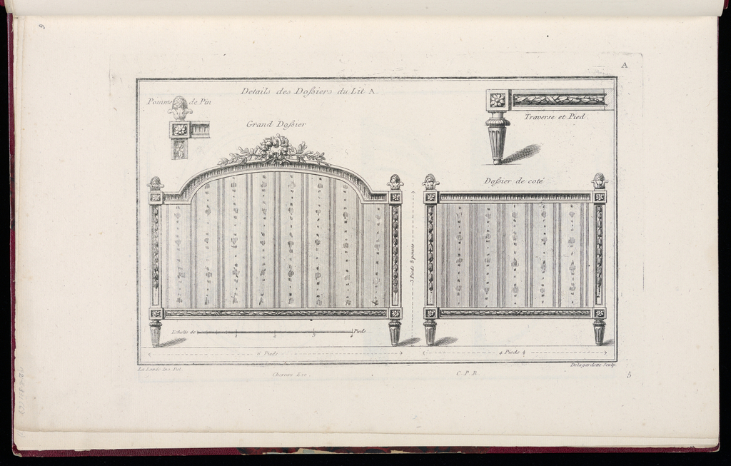 Printed upper left, in plate: Pomme de Pin; Printed upper left-center, in plate: Details des Dossiers du Lit A. / Grand Dossier; Printed upper right-center, in plate: Traverse et Pied. / Dossier de coté; Printed upper right, in plate: A; Printed lower center, in plate: Chereau Exc. C.P.R.; Printed lower right, in plate: 5; Inscribed in graphite, upper left, in margin: 6; Inscribed in graphite, lower left, in margin: 1921-6-331(6)