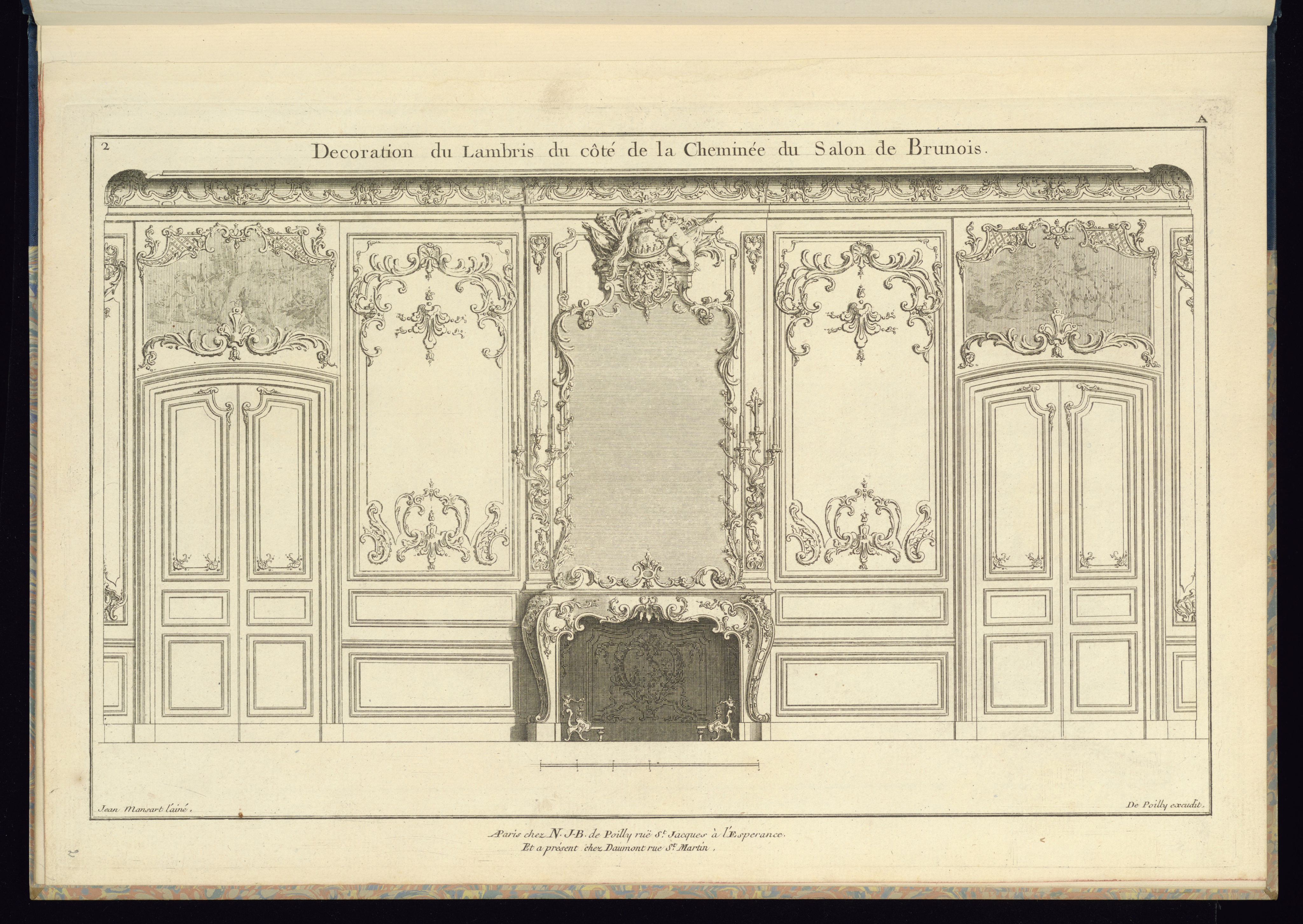 Numbered in plate, upper left: 2; lettered upper center: Decoration du Lambris du côté de la Cheminée du Salon de Brunois; lettered upper right: A; inscribed in graphite lower left margin: 2