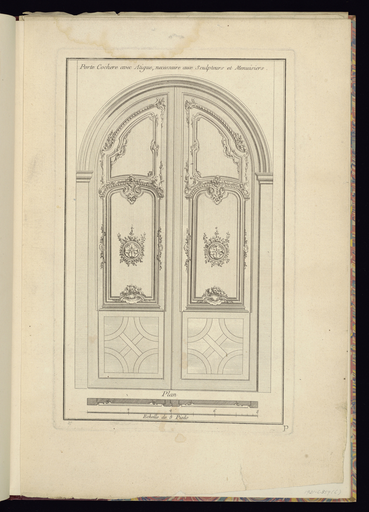 Lettered in plate, upper center: Porte Cochere avec Atigue, necessaire aux Sculpteurs et Menuisiers; lettered lower right: P; lettered lower center: Plan / Echelle de 8 Pieds; inscribed in graphite lower left: 27
