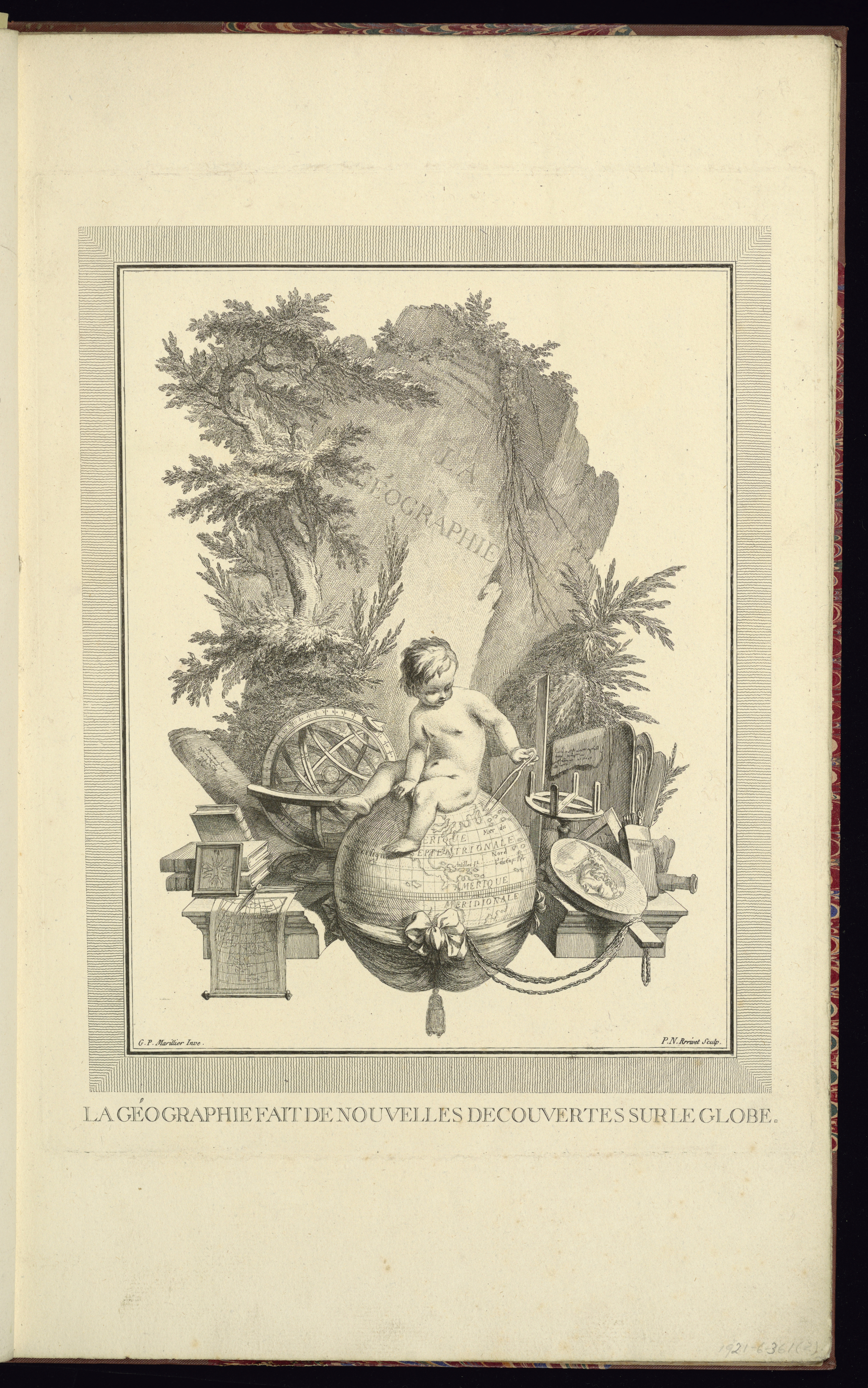 Lettered in plate, upper center: LA/ GÉOGRAPHIE; lettered lower center: LA GÉOGRAPHIE FAIT DE NOUVELLES DECOUVERTES SUR LE GLOBE