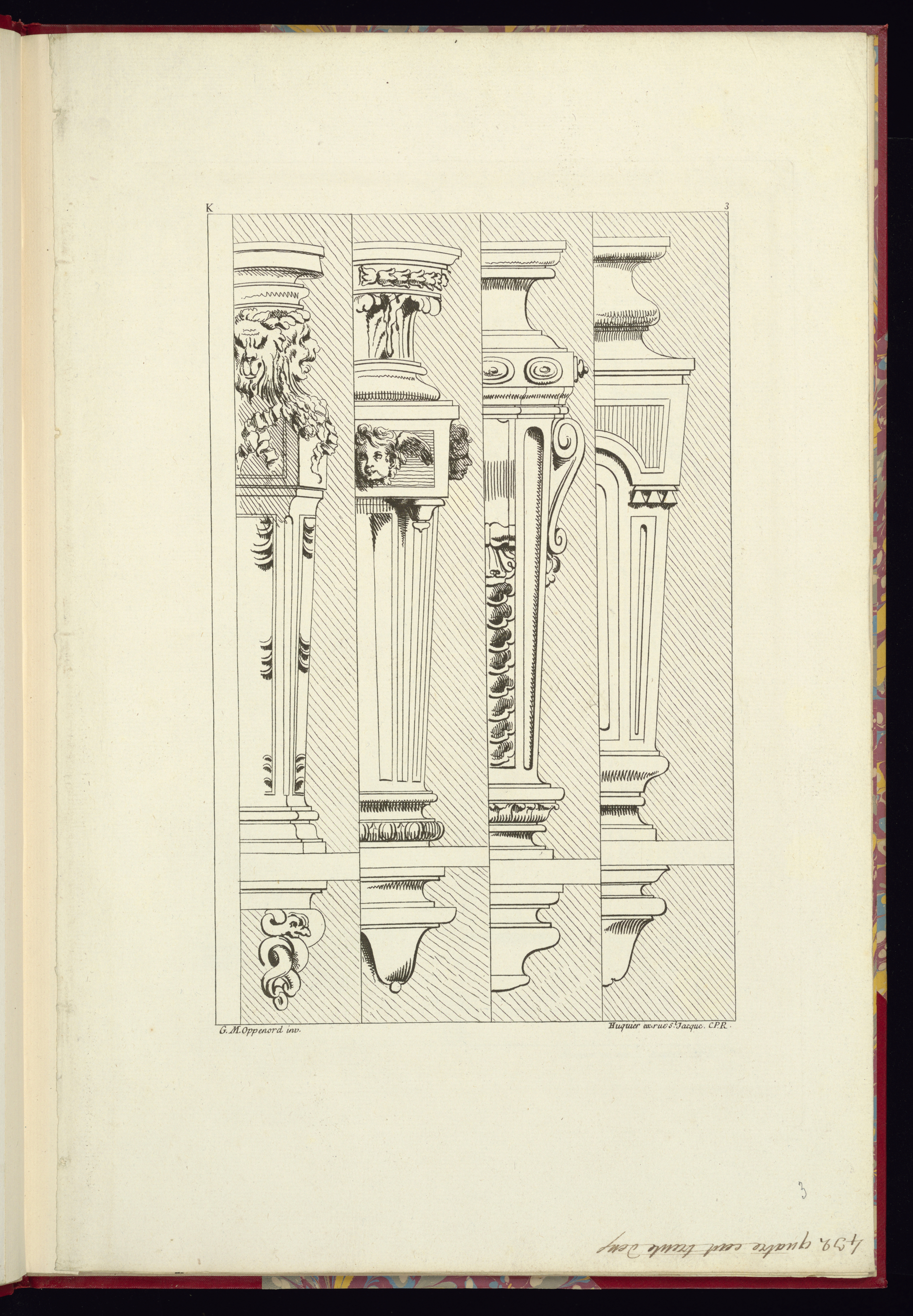 Print, Pedestal Designs; Designed by Gilles-Marie Oppenord (French, 1672–1742); Print Maker: Gabriel Huquier (French, 1695–1772); France; etching and engraving on laid paper; Purchased for the Museum by the Advisory Council; 1921-6-365-3