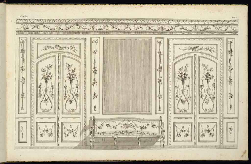 Print, Interior Wall Elevation with a Sofa; Designed by Pierre Ranson (French, 1736–1786); Print Maker: Jacques Juillet (French, 1739 - 1784); Published by Émilie-Louise Avaulez (French, active 1777 – 1779); etching and engraving on laid paper; Sheet: 31.8 × 49.6 cm (12 1/2 × 19 1/2 in.) Platemark: 26.7 × 45.8 cm (10 1/2 × 18 1/16 in.) Image: 26.4 × 45.5 cm (10 3/8 × 17 15/16 in.); Purchased for the Museum by the Advisory Council; 1921-6-392-3