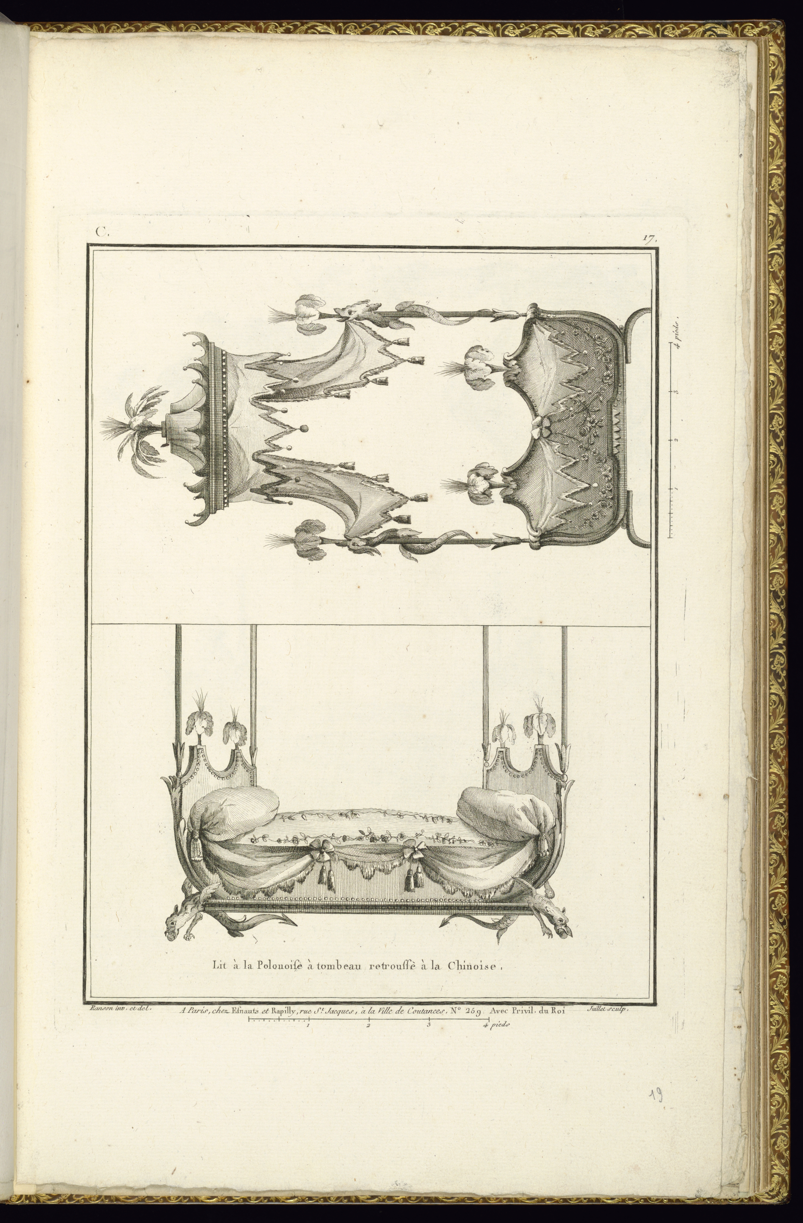 Lettered in plate, upper left: C; numbered upper right: 17; inscribed in graphite lower right margin: 19; lettered in plate, lower center: Lit à la Polonaise à tombeau retroussé à la Chinoise