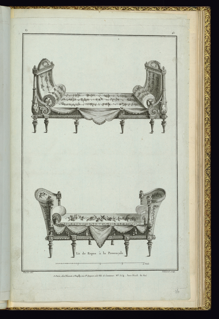 Print, Lit de Repos à la Provançale; Designed by Pierre Ranson (French, 1736–1786); Print Maker: A.B. Duhamel (French, b. 1736); Published by Esnauts et Rapilly (French, 1770 - 1820); etching and engraving on blue paper; Purchased for the Museum by the Advisory Council; 1921-6-395-44