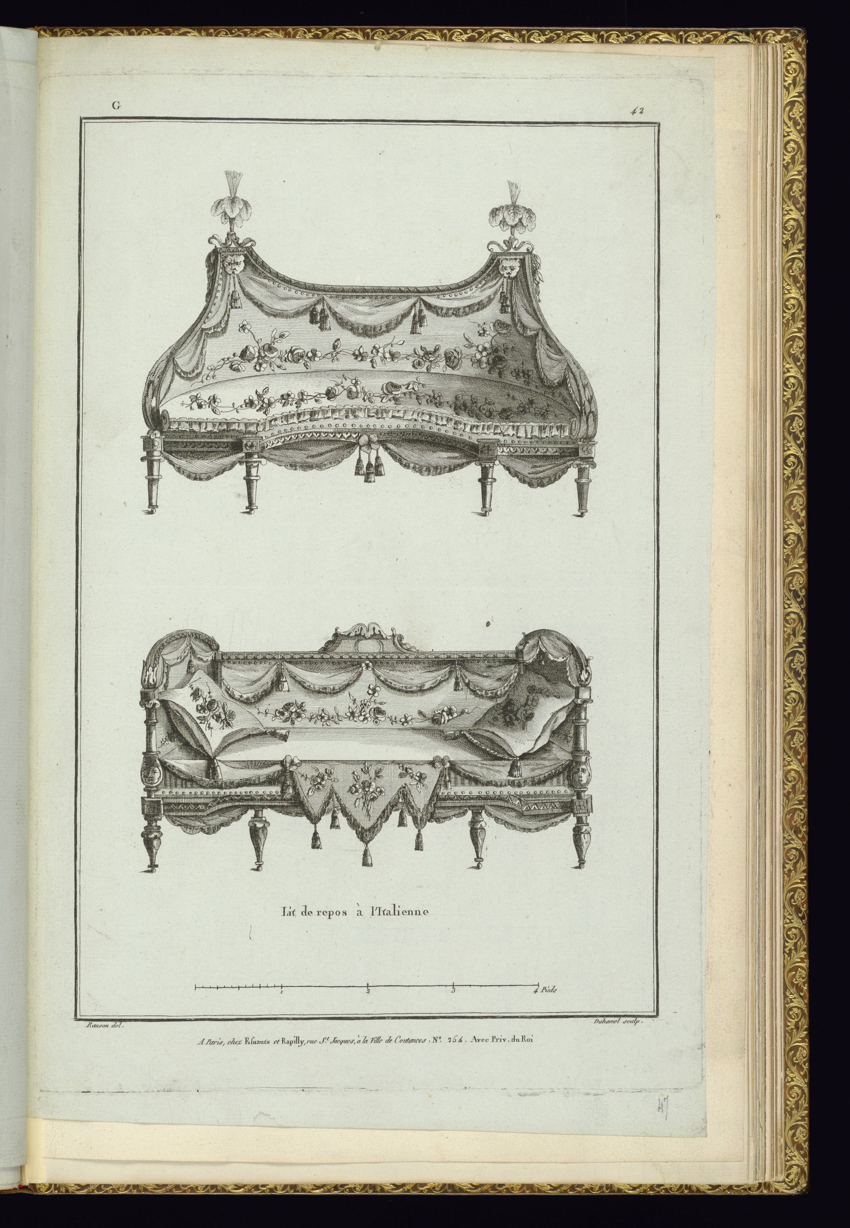 Lettered in plate, upper left: G; numbered in plate upper right: 42; inscribed in graphite lower right margin: 47; lettered in plate lower center: Lit de Repos à l’Italienne