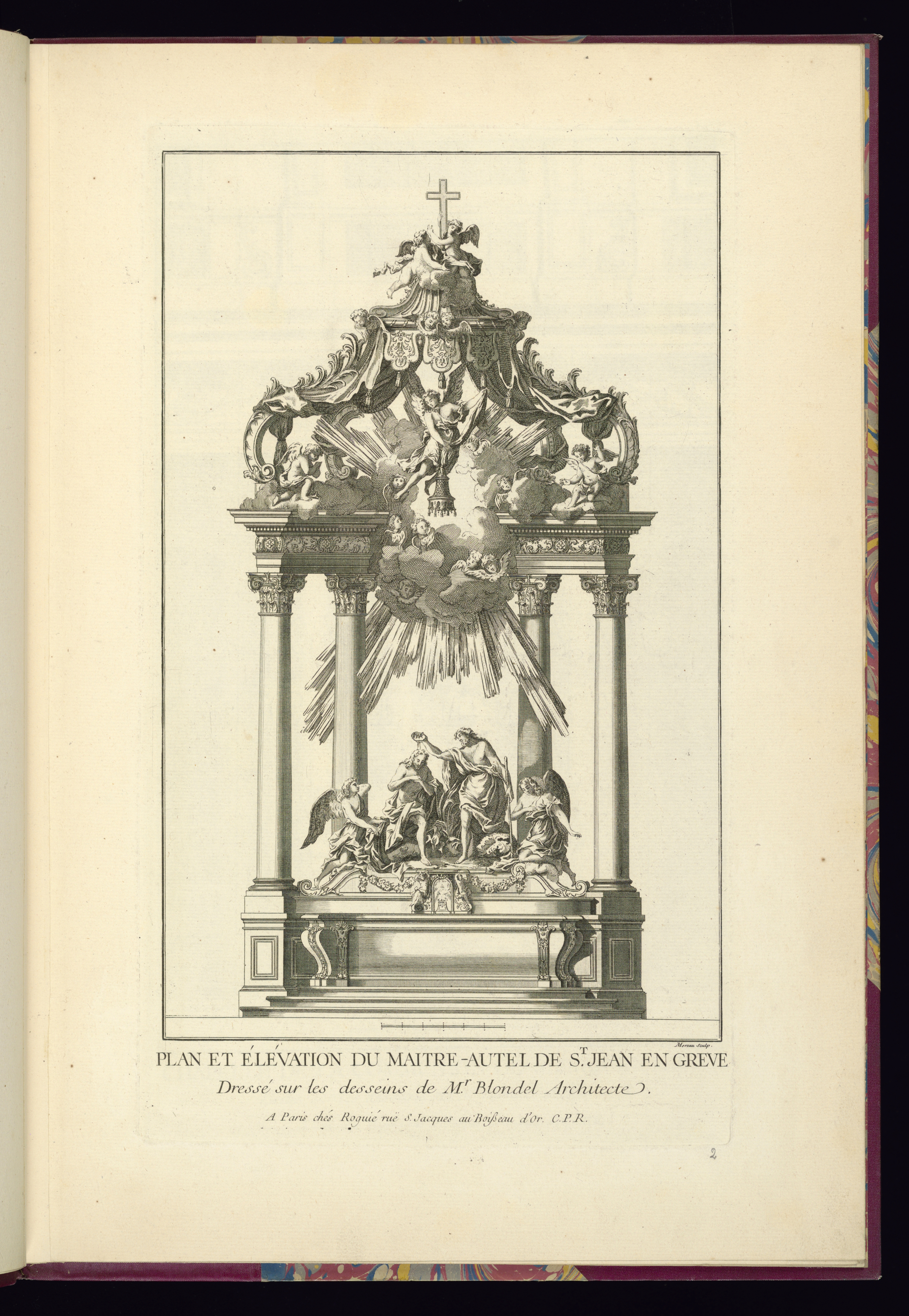 Lettered lower center, in plate: PLAN ET ÉLÉVATION DU MAITRE-AUTEL DE ST.JEAN EN GREVE / Dressé sur les desseins de Mr. Blondel Architecte. / A Paris chés Roguié ruë S. Jacques au Boißeau d'Or. C.P.R.; Inscribed in graphite, lower right, in margin: 2