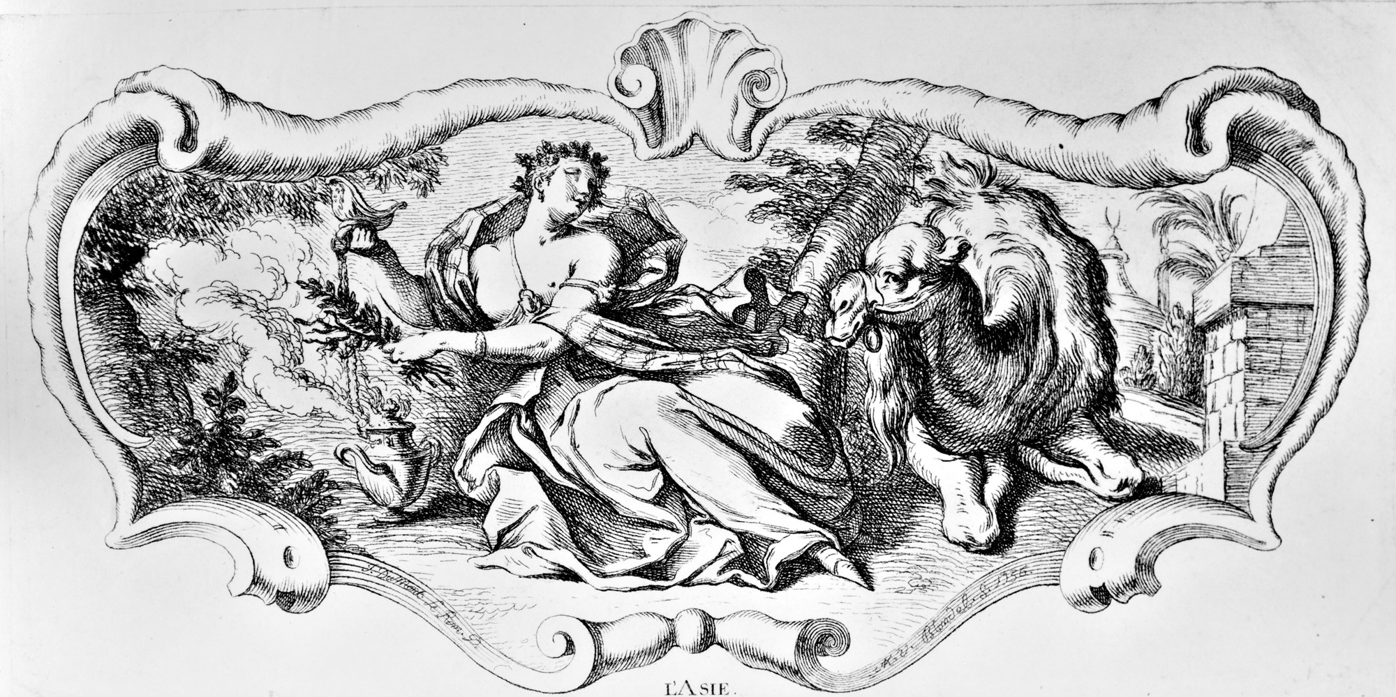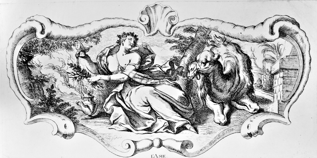 Print, L'Asie; Print Maker: Marie Michelle Blondel (French, active mid 18th century); After Jacques Dumont (French); Published by Mlle. Dobe (Active in France, eighteenth century); France; etching on paper; Purchased for the Museum by the Advisory Council; 1921-6-447-2