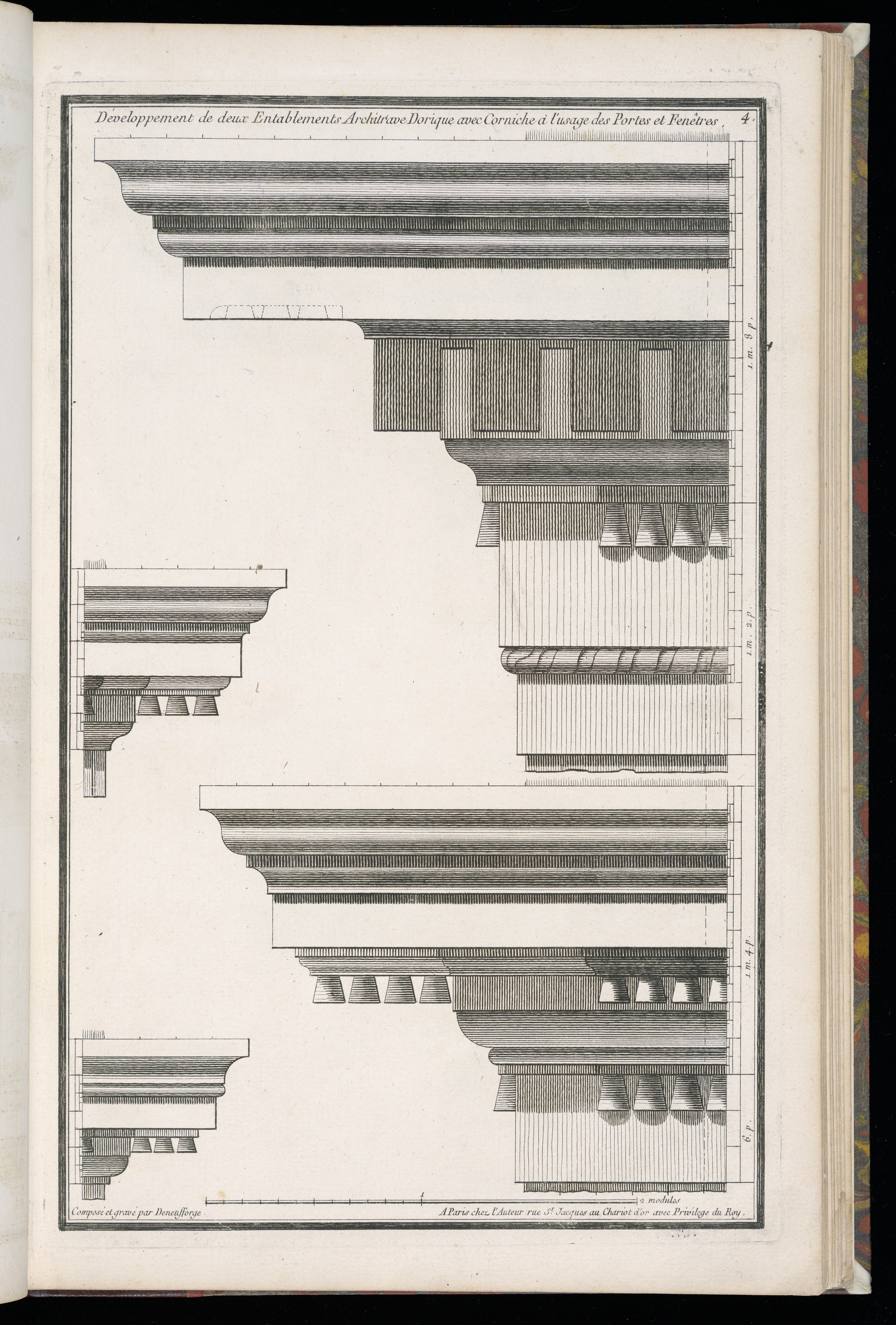 Printed upper center, in plate: Developpement de deux Entablements Architrave Dorique avec Corniche à l'usage des Portes et Fenêtres; Printed upper right, in plate: 4.