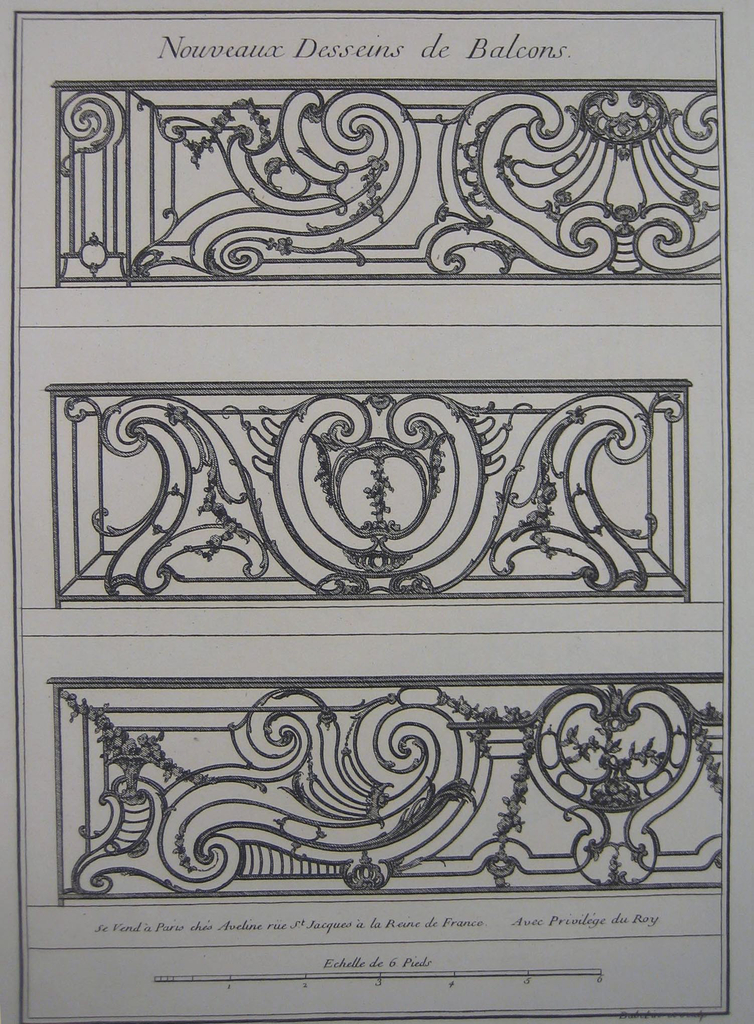 Lettered in plate, upper center: Nouveaux Desseins de Balcons; lettered lower center: Echelle de 6 Pieds.; inscribed in graphite lower right margin: 1921-6-452(7)