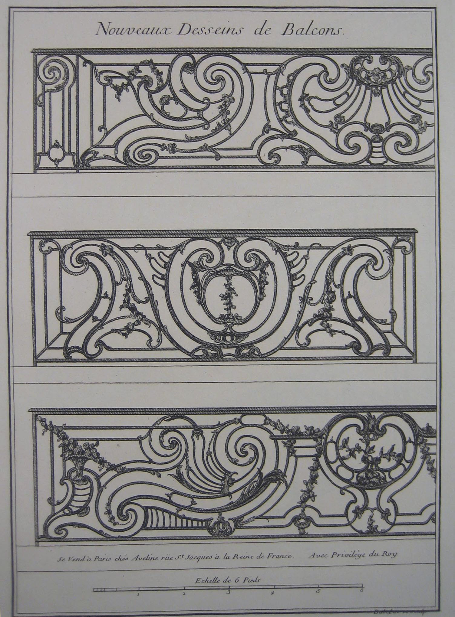 Print, Nouveaux Desseins de Balcons; Designed by Pierre Edme Babel (French, 1720–1775); Published by Charles Auguste Foulard (French, 1870–1920), Antoine Aveline (French, 1691 – 1743); France; facsimile of the original etching (photomechanical or lithography); Purchased for the Museum by the Advisory Council; 1921-6-452-7