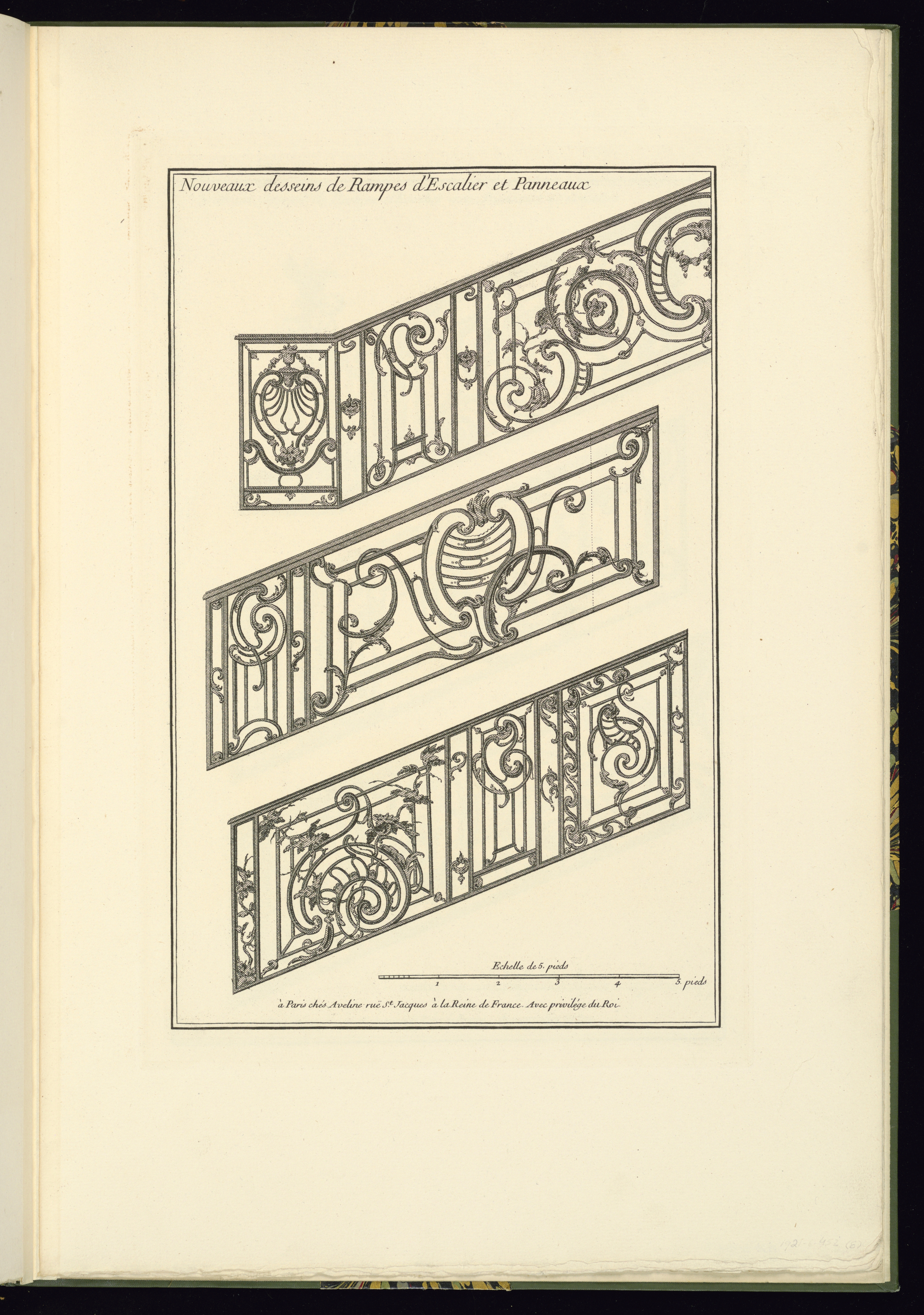 Lettered in plate, upper center: Nouveaux desseins de Rampes d’Escalier et Panneaux; lettered lower center: Echelle de 5 Pieds.; inscribed in graphite lower right margin: 1921-6-452(8)