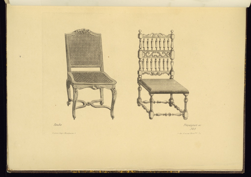Print, Two Chair Designs; Designed by André-Jacob Roubo (French, 1739–1791); Printed by Pierron (French, active 1849 – 1866); Print Maker: Auguste Péquégnot (French, 1819 – 1878); France; etching on paper; Purchased for the Museum by the Advisory Council; 1921-6-456-12