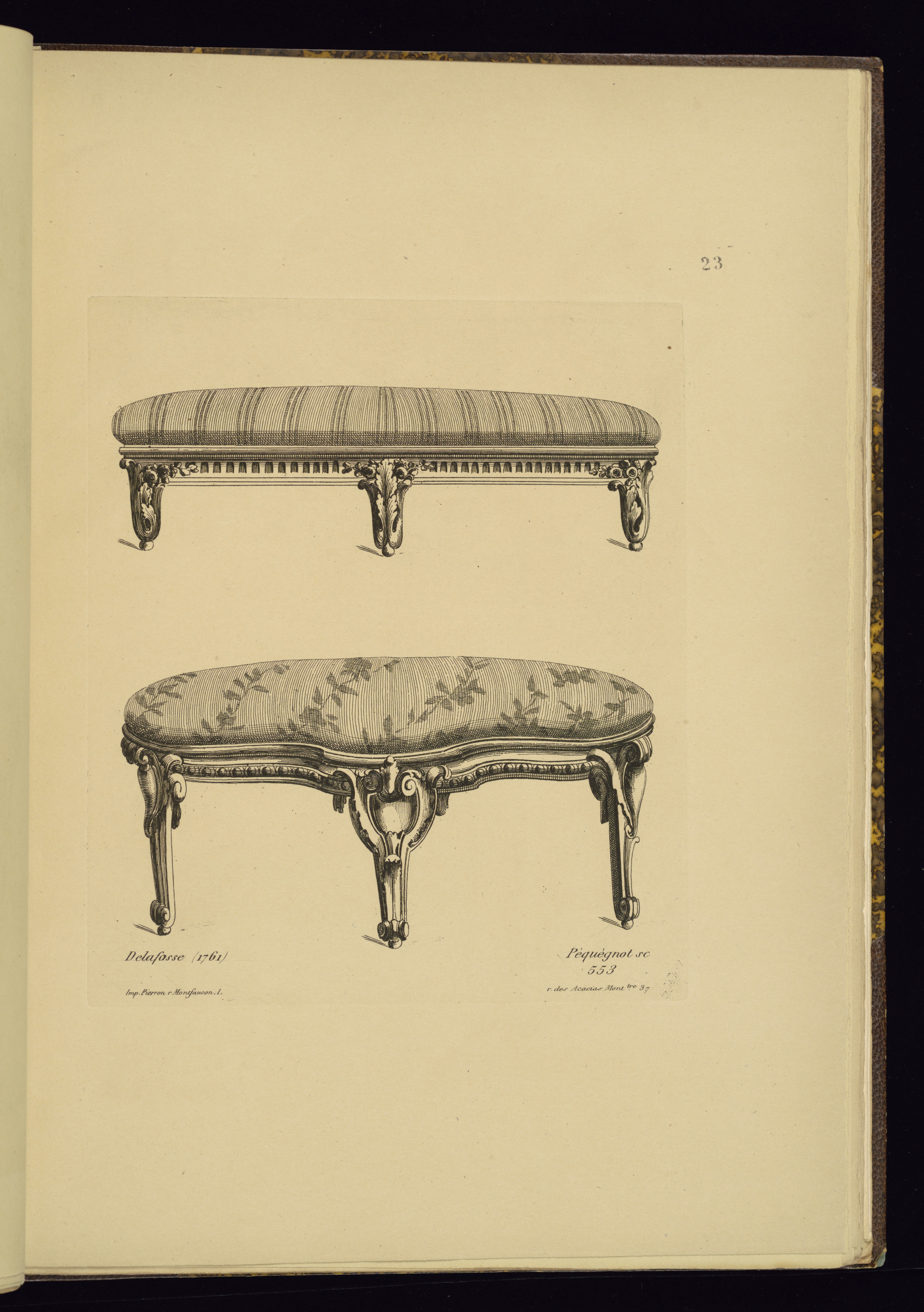 Print, Two Bench Designs; Print Maker: Auguste Péquégnot (French, 1819 – 1878), Jean-Charles Delafosse (French, 1734–1791); Printed by Pierron (French, active 1849 – 1866); France; etching on paper; Purchased for the Museum by the Advisory Council; 1921-6-456-19