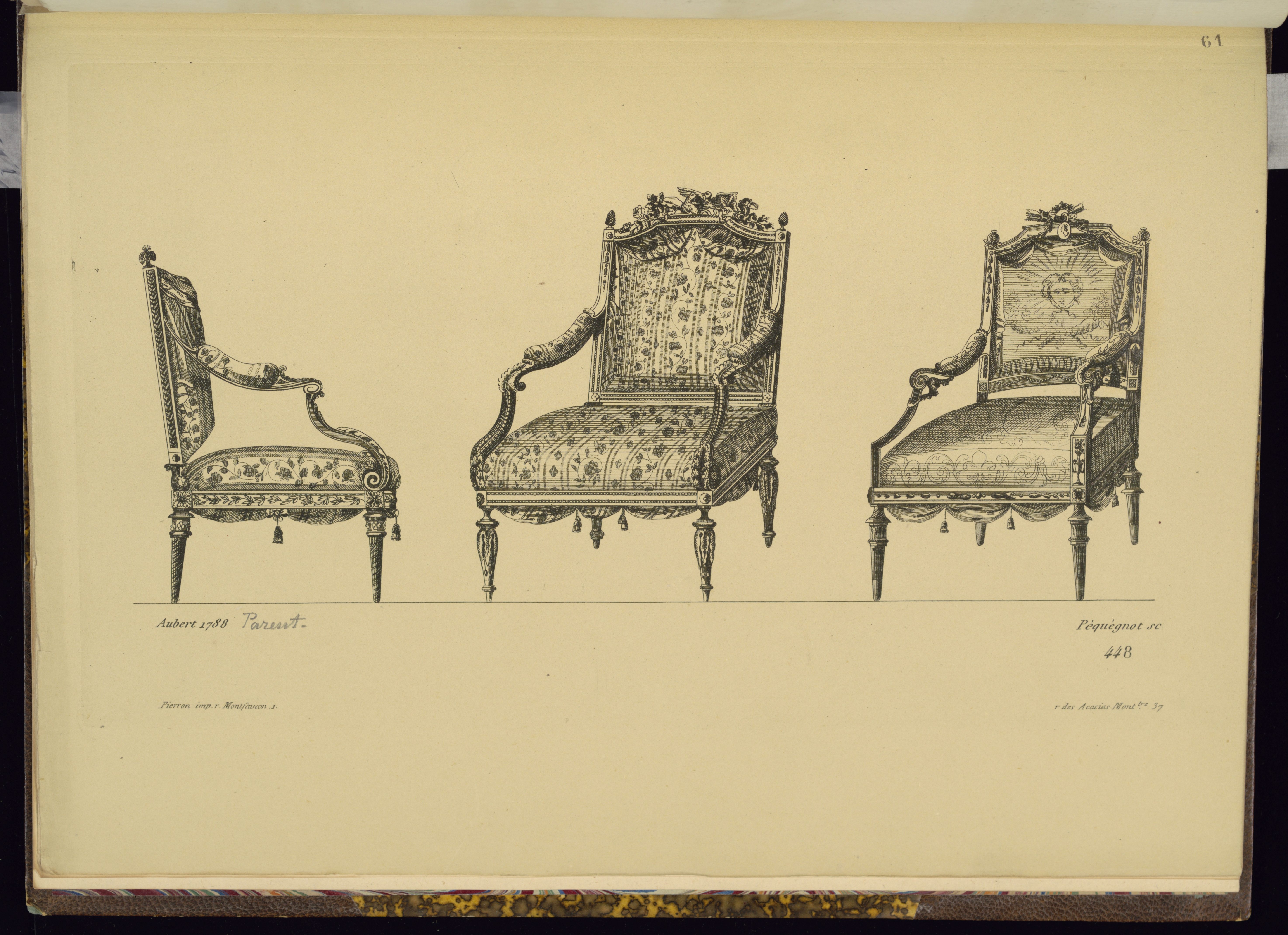 Print, Three Armchair Designs; Designed by Aubert Henri Joseph A. Parent (French, 1753 - 1835); Printed by Pierron (French, active 1849 – 1866); Print Maker: Auguste Péquégnot (French, 1819 – 1878); France; etching on paper; Purchased for the Museum by the Advisory Council; 1921-6-456-55