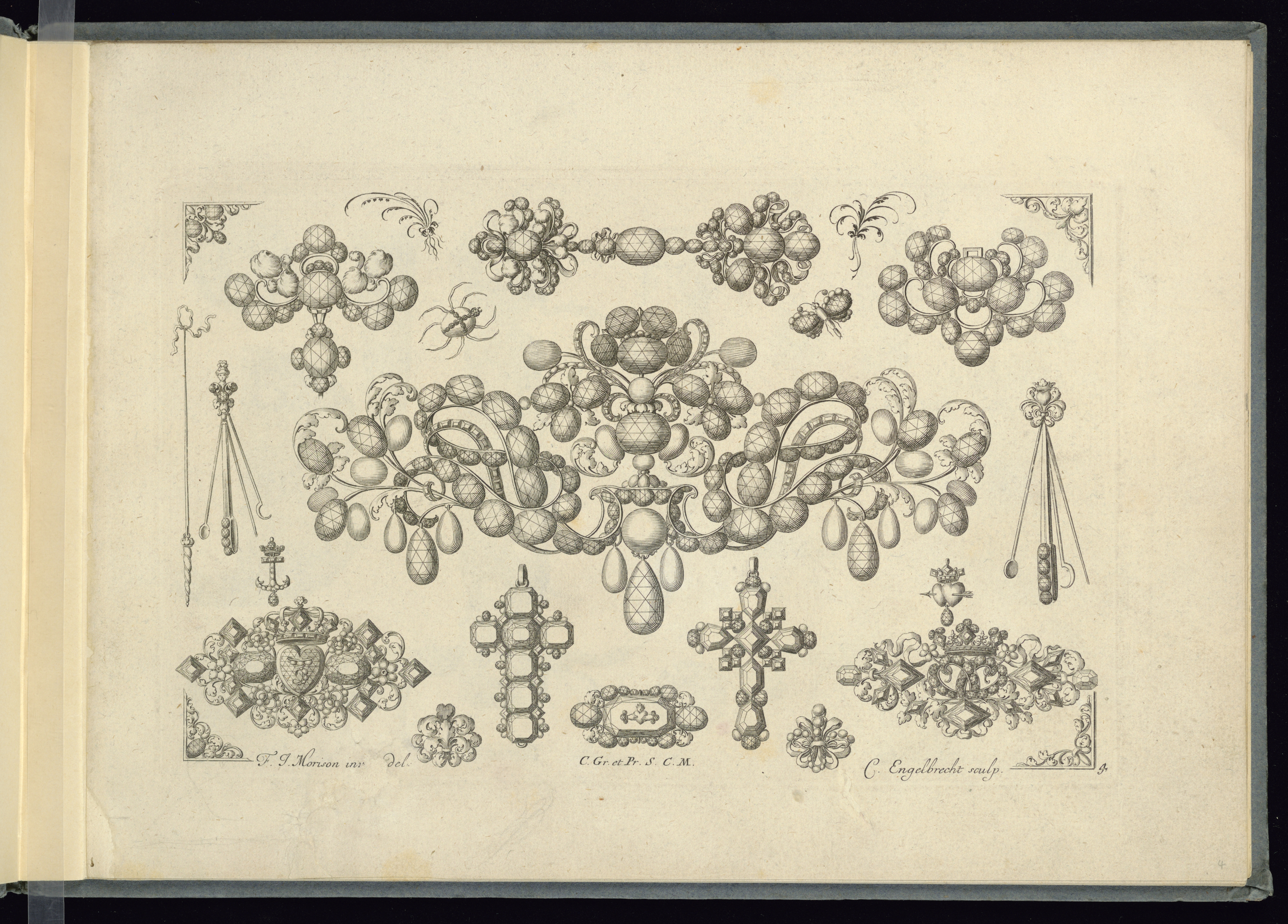 Print, Jewelry Designs; Designed by Friedrich Jacob Morison (German, active 1693 – 1699); Print Maker: Christian Engelbrecht (German, 1672–1753); Published by Jeremias Wolff (German, 1663–1750); Germany; engraving on laid paper; Purchased for the Museum by the Advisory Council; 1921-6-466-4
