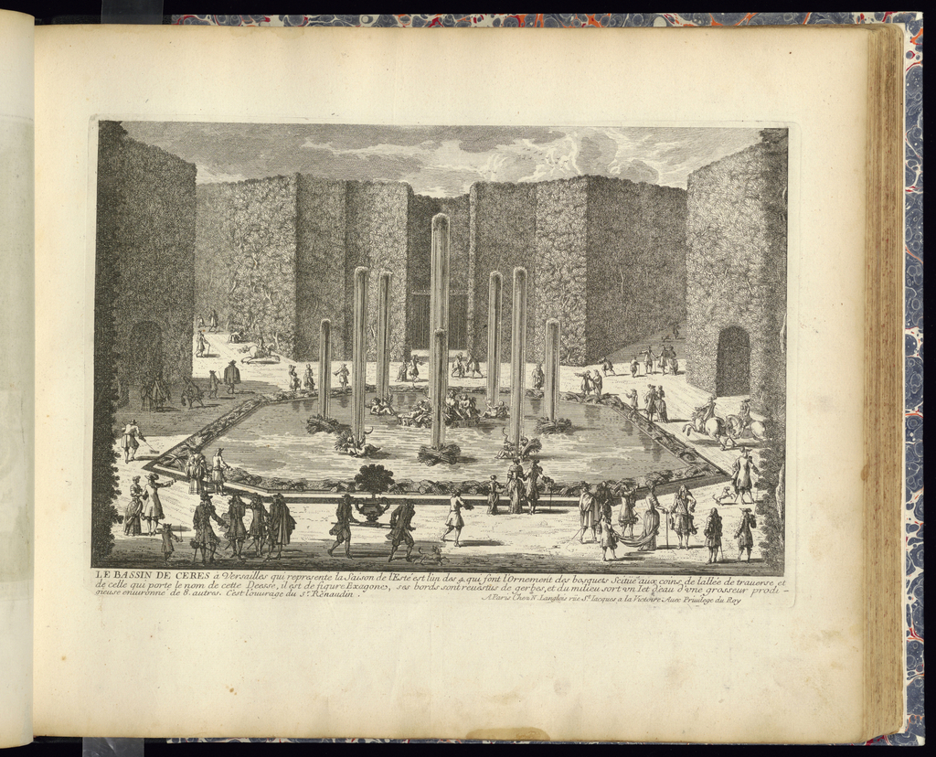 Lettered in plate, lower center: LE BASSIN DE CERES à Versailles qui represente la Saison de l’Esté est l’un des 4 qui font l’Ornement des bosquets scitüé aux coins de l’allée de traverse et/ de celle qui porte le nom de cette Deesse, il est de figure Exagone, ses bords sont revestus du gerbes, et du milieu sort un Jet d’eau d’une grosseur prodi-/gieuse environné de 8 autres. C’est l’ouvrage du Sr. Renaudin.