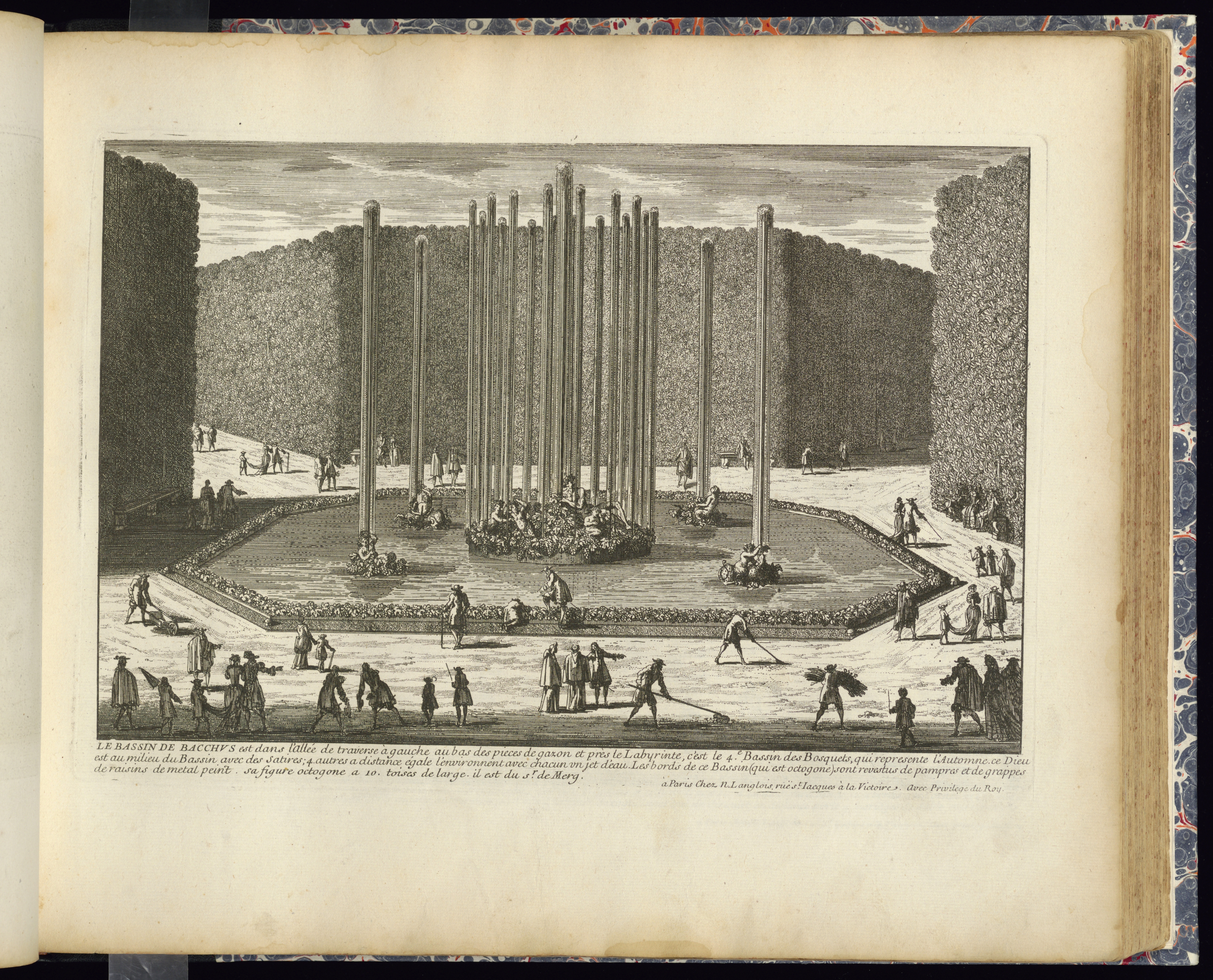 Lettered in plate, lower center: LE BASSIN DE BACCHUS est dans l’allée de traverse à gauche au bas des pieces de gazon et près le Labyrinte, c’est le 4e Bassin des Bosquets, qui represente l’Automne ce Dieu/ est au milieu du Bassin avec des satires; 4 autres a distance égale l’environnent avec chacun un jet d’eau. Les bords de ce Bassin qui est octogone sont revestus de pampers et de grappes/ de raisins de metal peint sa figure octogone a 10 toises de large. il est du Sr. de Merg.
